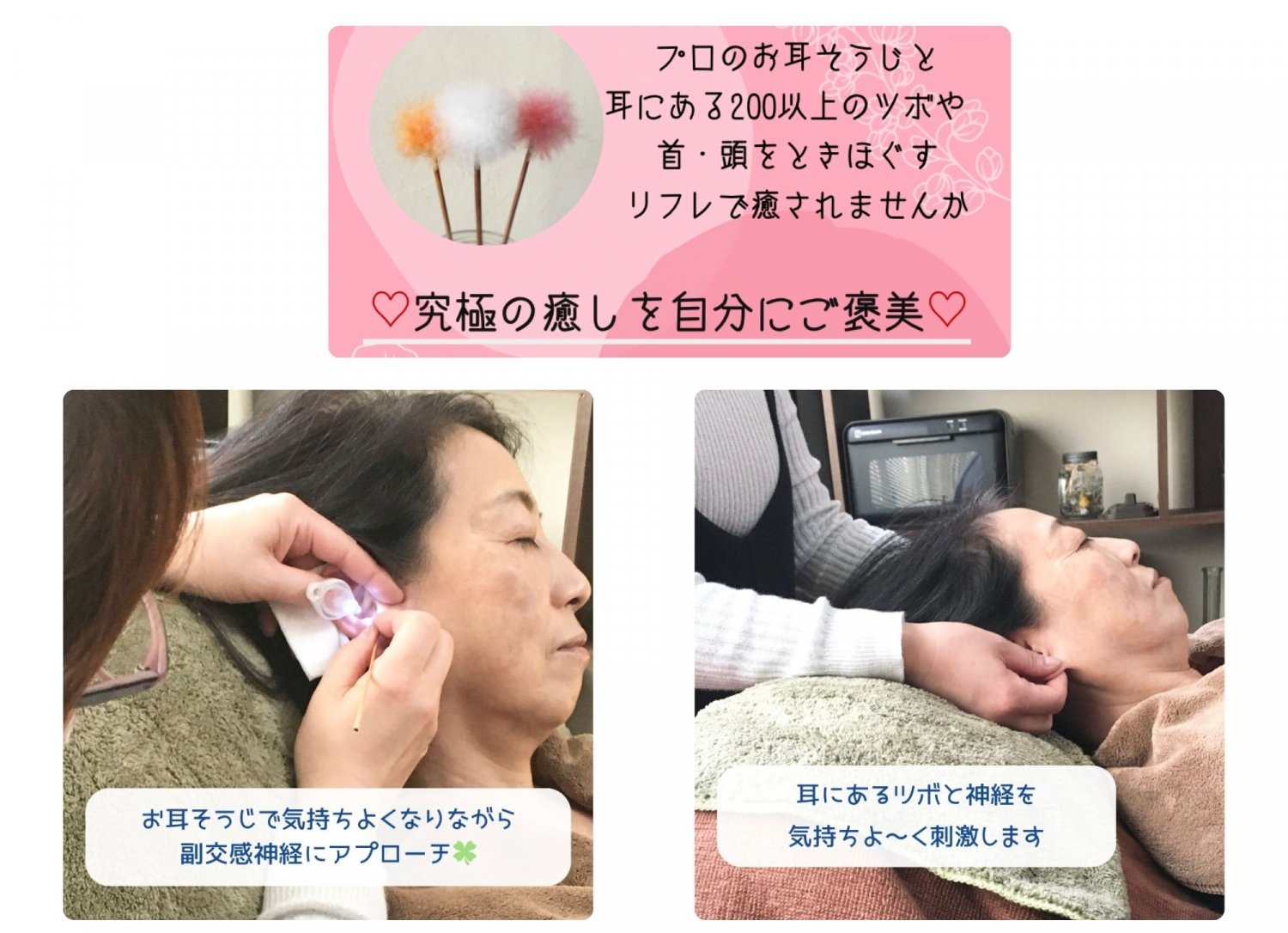 ※耳スパコースは、耳そうじ→耳リフレ→首リフレ→耳洗浄→耳角質取り→ヘッドリフレのトータルコースです。