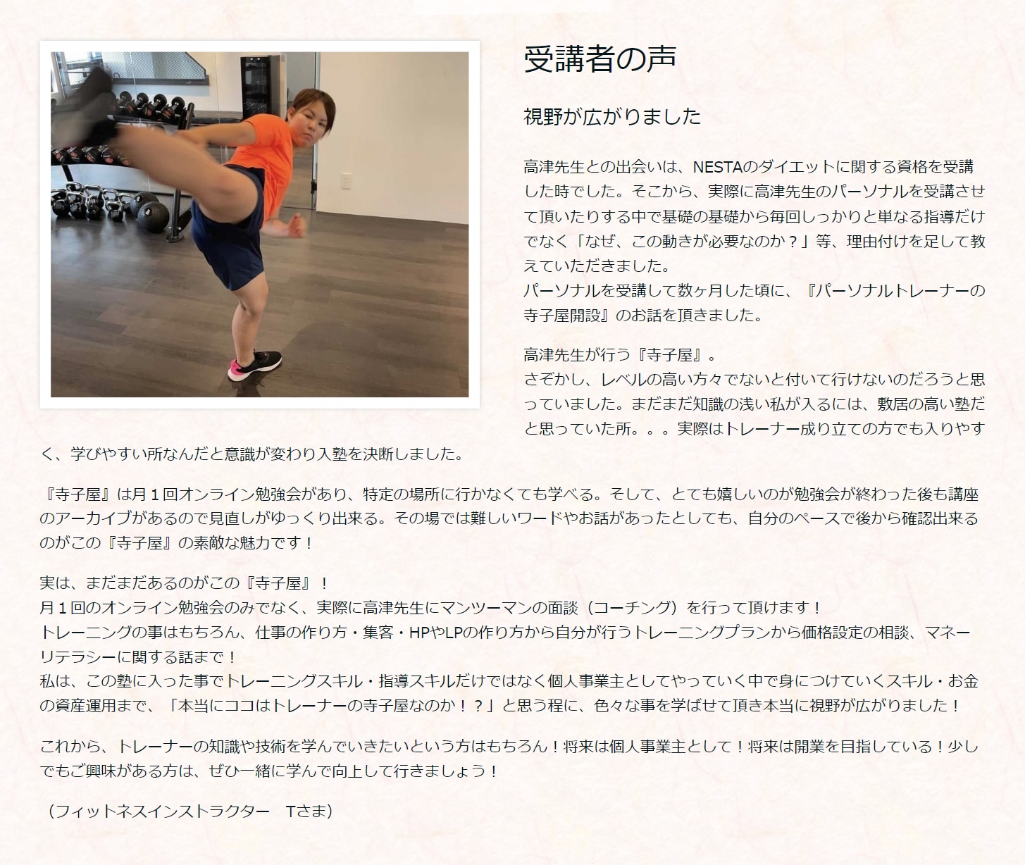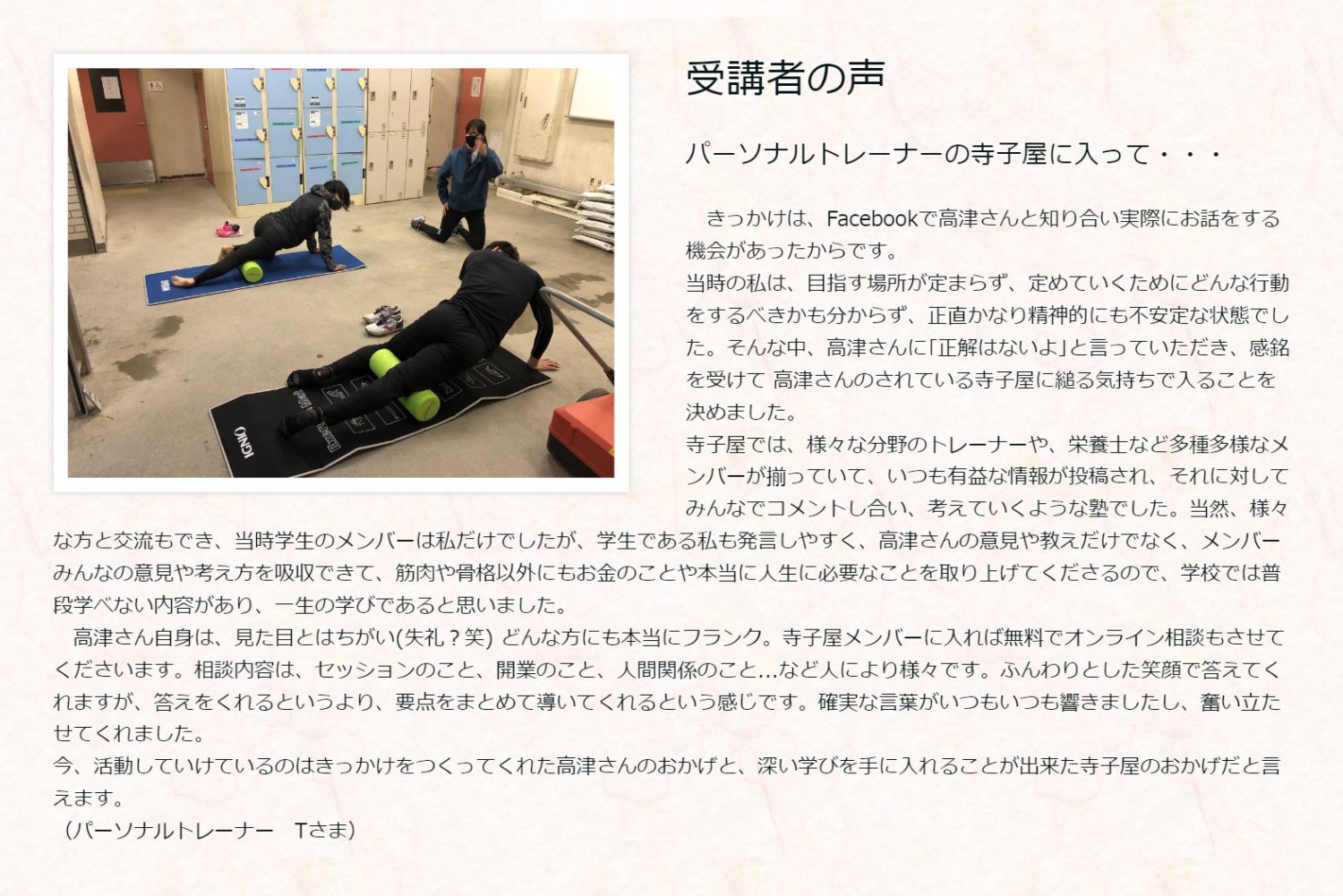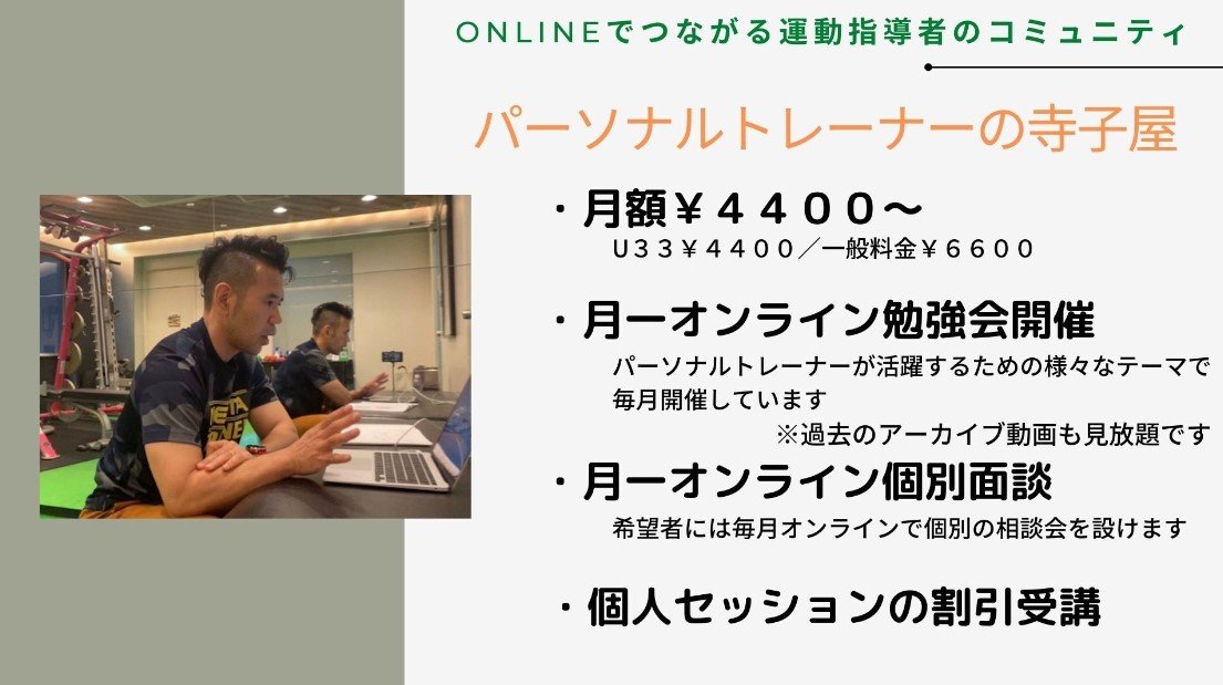 パーソナルトレーナーを受けるお客様は我々トレーナーへ自己投資をされています。パーソナルトレーニングの1回の単価は全国平均で7700円/1セッション。そのサービスを提供する側として、パーソナルトレーナーの寺子屋をご自身の成長のための自己投資と考え、存分に活用しより多くのリターンを得てください。