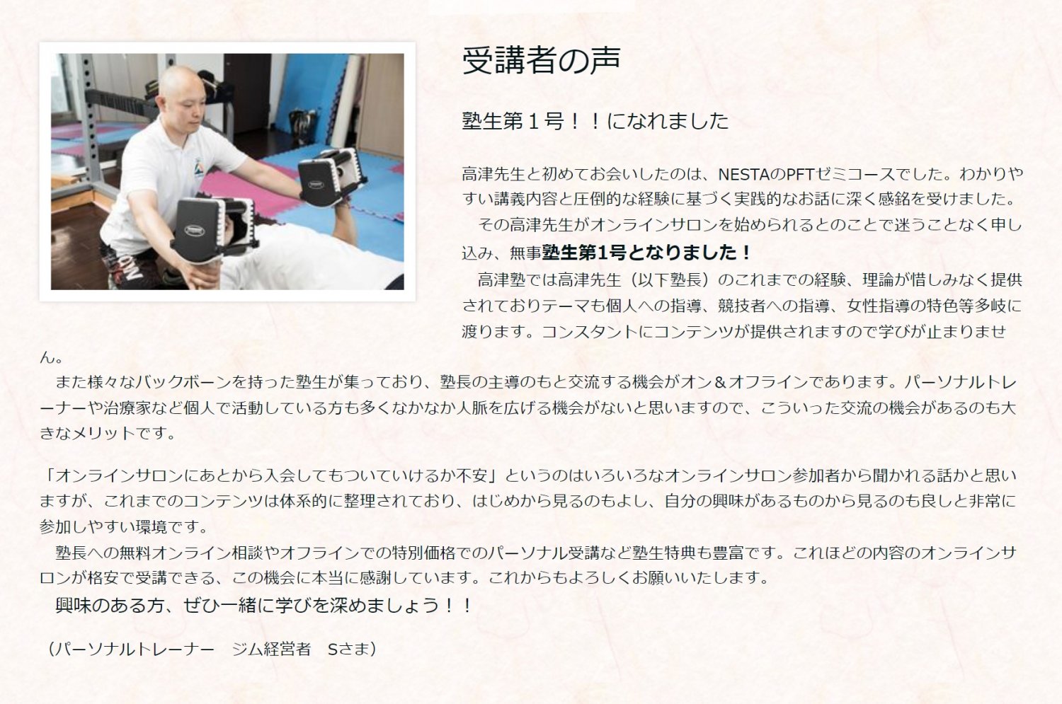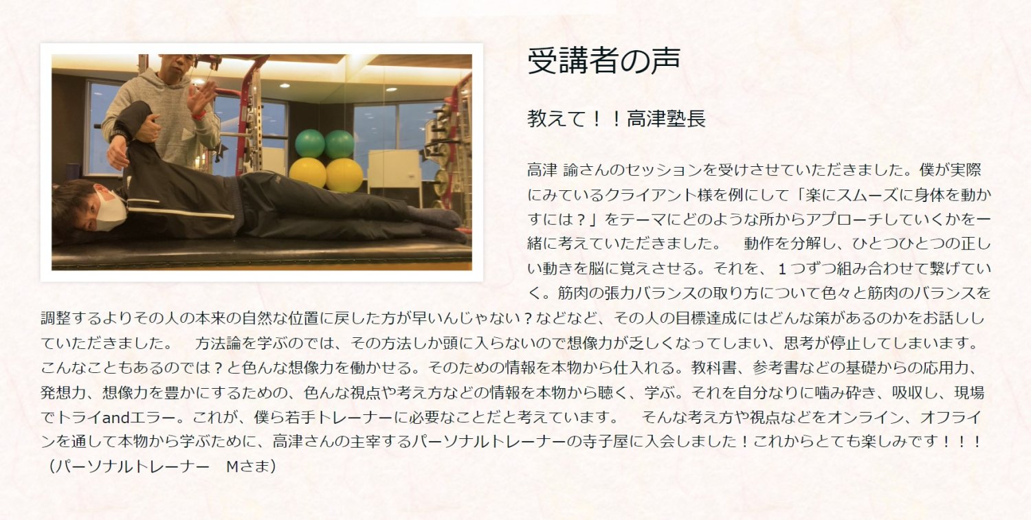 投稿記事は「パーソナルトレーナーの寺子屋塾生専用ブログ」にて時系列またカテゴリ別に整理してご覧いただけるようになります。