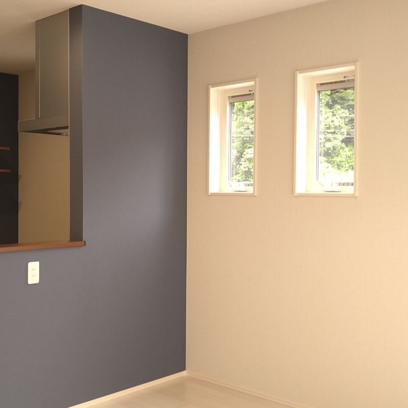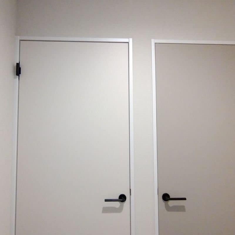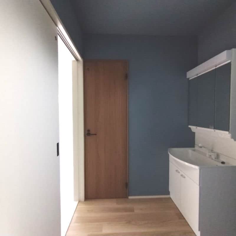 壁紙やドアは白を基調にし、アクセントにはネイビーのクラフトレーベルドア。取っ手はもちろんアイアンブラックで決まり!!