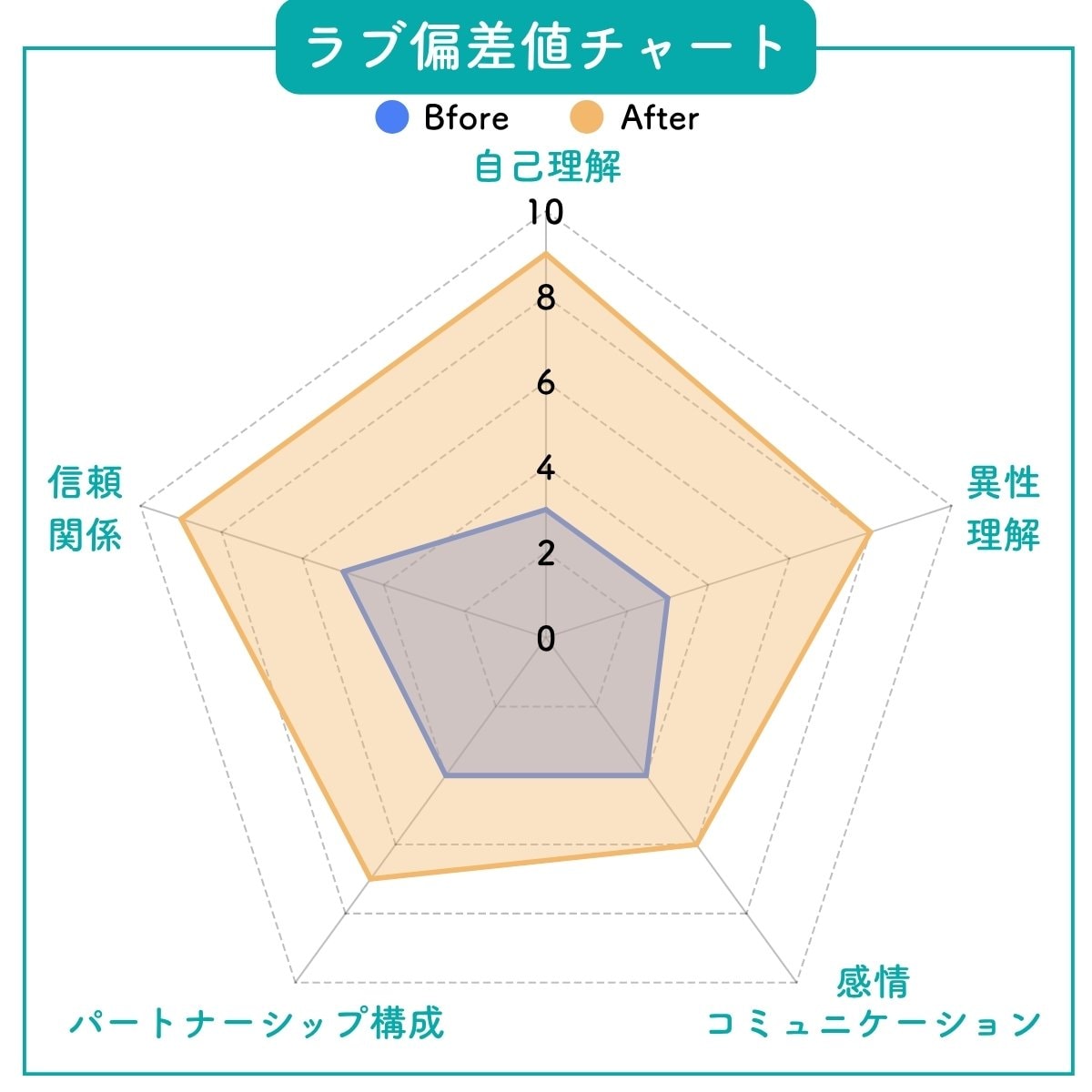 ラブ偏差値チャート現状を可視化し、足りない要素をピンポイントで引き上げます。Before/Afterの差は、まさに「スキルの差」です。