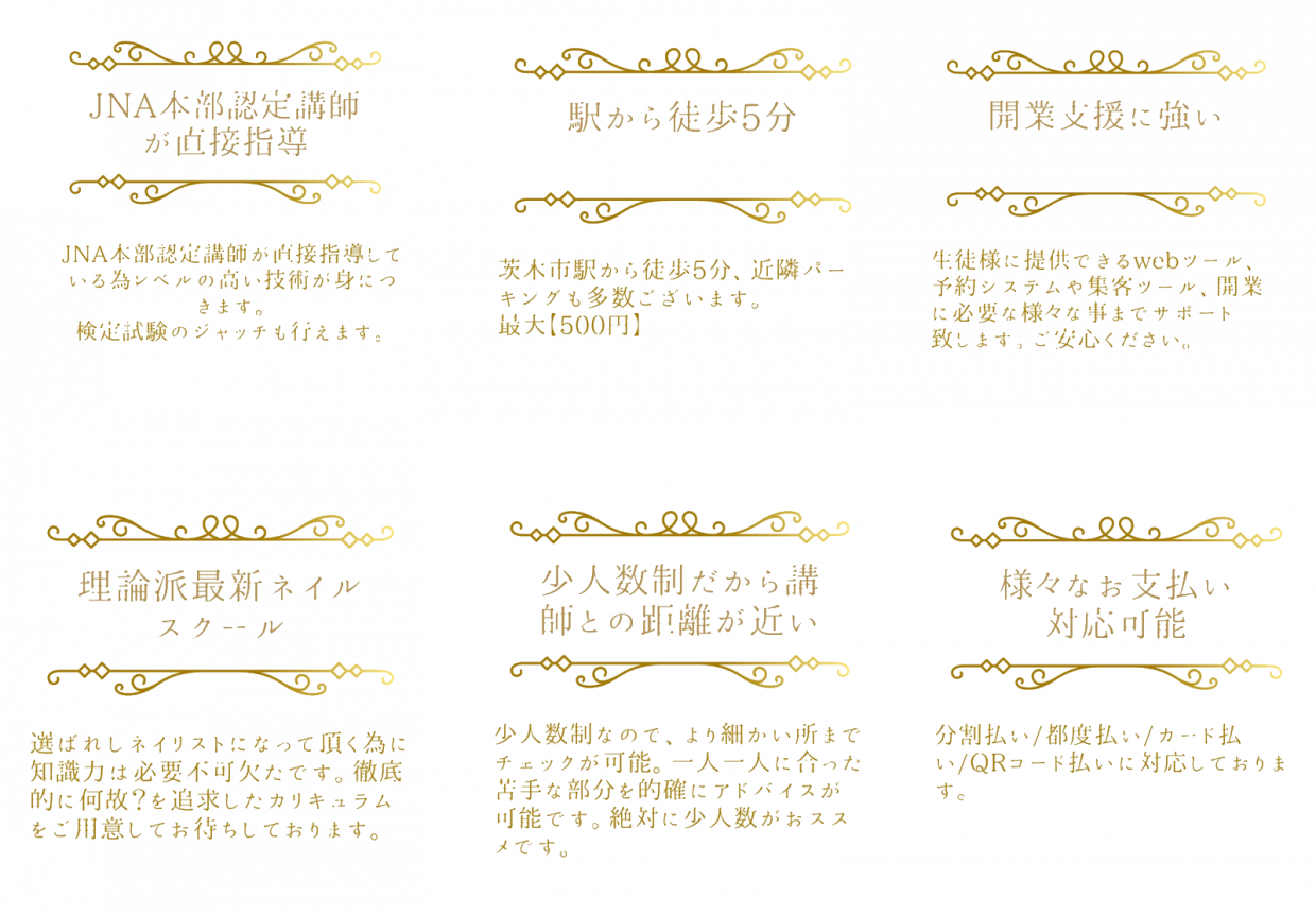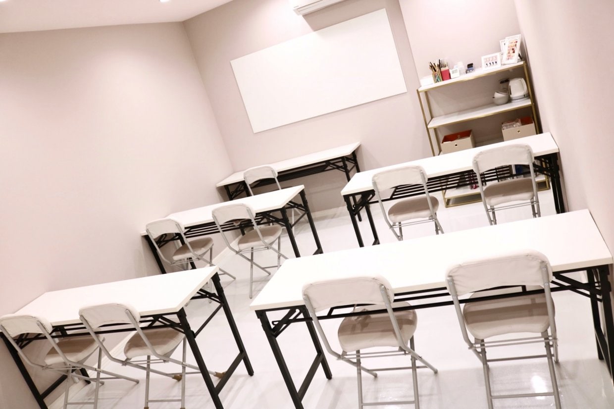集中できる環境と最大8名までのマンツーマン・少人数制の充実したレッスンで、短時間でもじっくり確実に身につけられることを目標としたネイルスクールです。