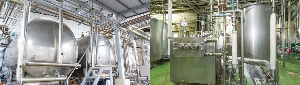 おなかの中で消化されやすくするためと、クリーム分離しにくくするために、ホモジナイザーという機械で生乳に強い圧力をかけ脂肪の粒を細かくします。