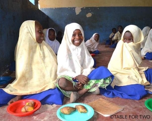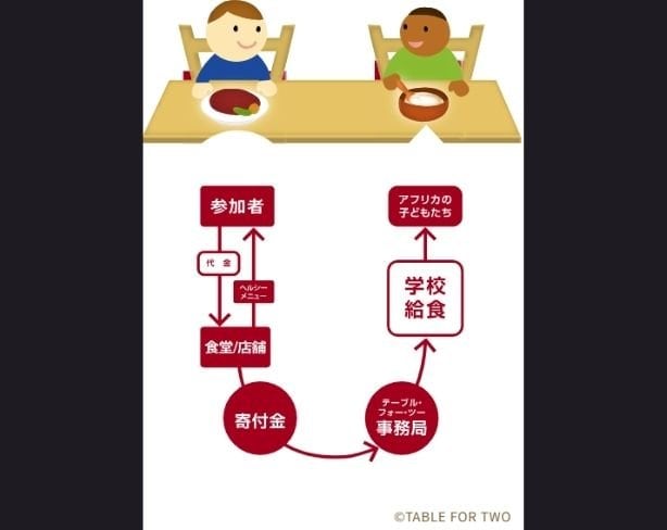 先進国で1食とるごとに開発途上国に1食が贈られるTABLE FOR TWO(=TFT)プログラムでは、肥満や生活習慣病予防のためにカロリーを抑えた定食や食品をご購入いただくと、1食につき20円の寄付金が、TFTを通じて開発途上国の子どもの学校給食になります。