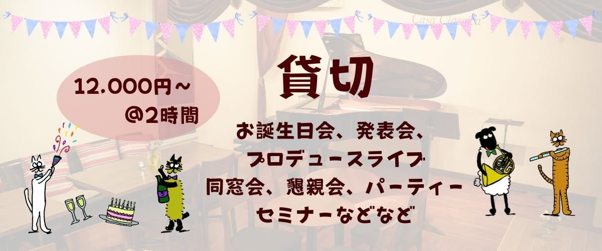 (昼の部用 ※別途延長チケットをお求めください。 ご利用者さま主催のライブ演奏会、その他音楽に関するイベント開催など貸切の 利用時間をご自由にお使いいただけます)