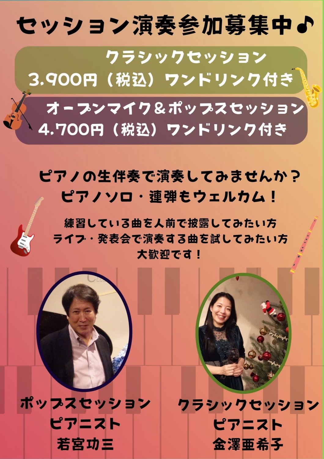 【ポップスセッション】学生チケットあり・・・オープンマイク&楽器演奏 ポップス・ジャズ・シャンソン・演歌が特におすすめ♬(ミュージカル曲の初見対応も可能です)