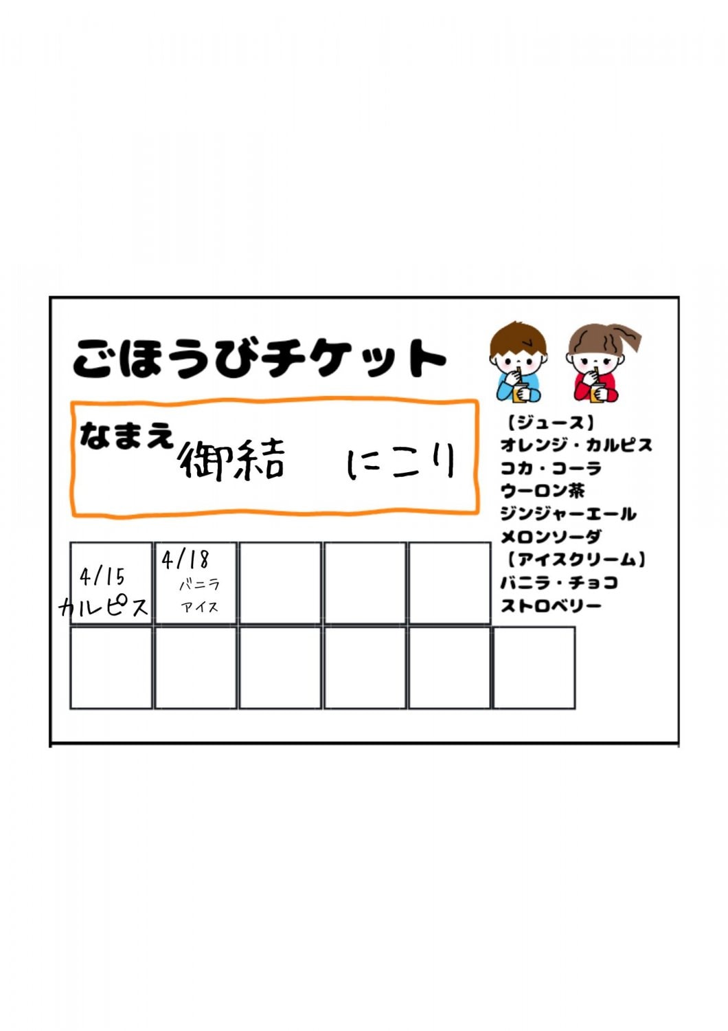 ごほうびチケットをご用意いたしました。宿題を終えたお子様へごほうびでジュースまたはアイスクリームが頼めるチケットとなっております。