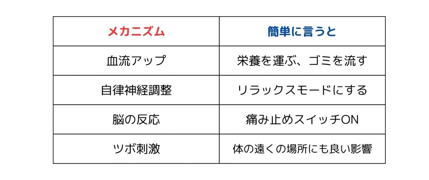 ○ツボに温かさを送るってどういうこと?体には「気(エネルギー)や血(けつ)」が流れてるって考え方があって、その流れが悪くなると不調になるって東洋医学では言われてるんだ。