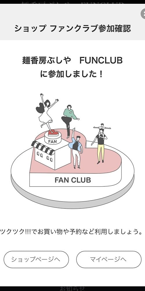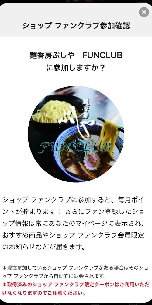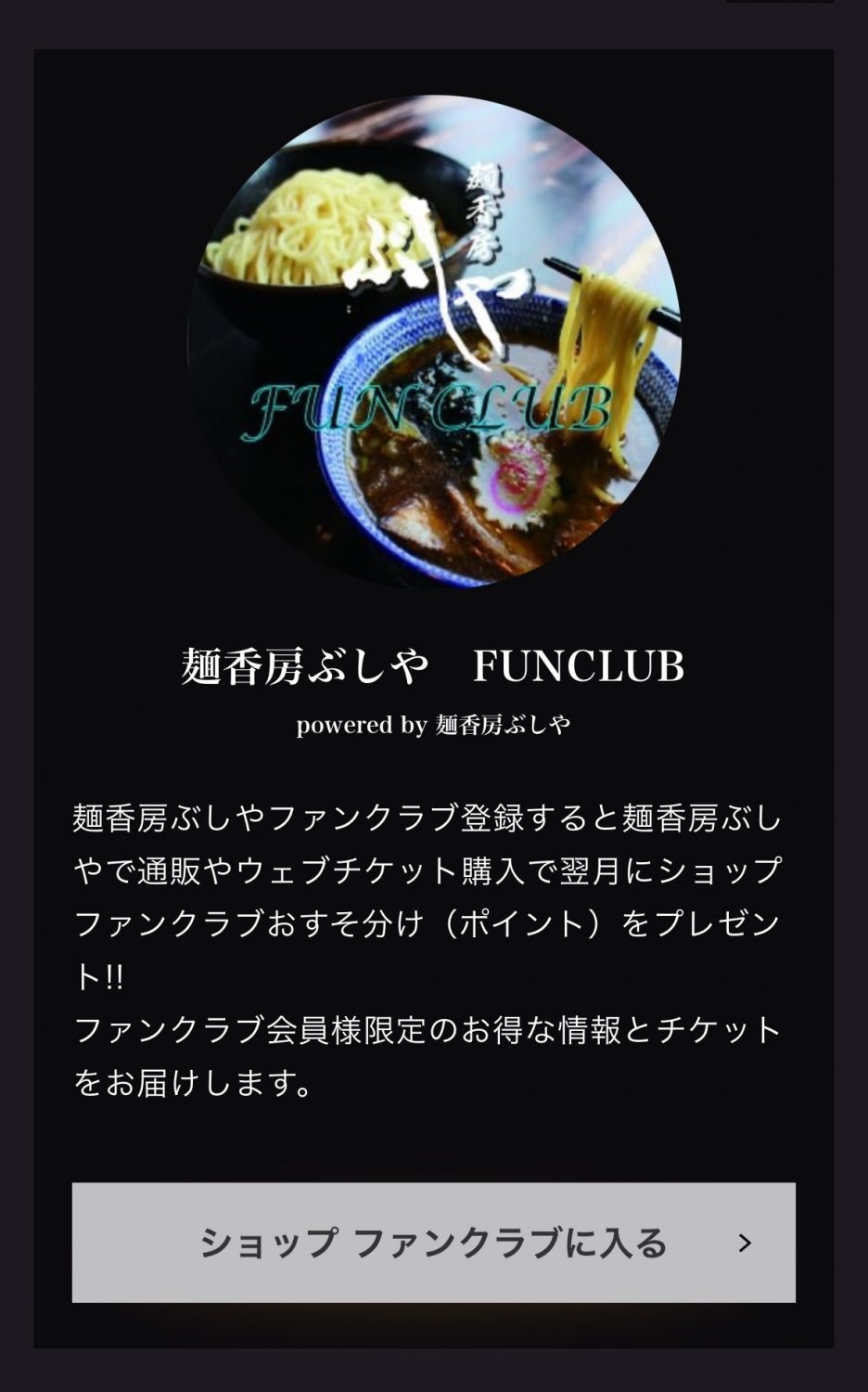 麺香房ぶしやのホーム画面にある【ショップファンクラブに入る】を選択していただくことで、簡単にご登録ができます。