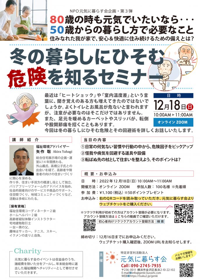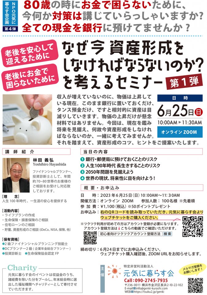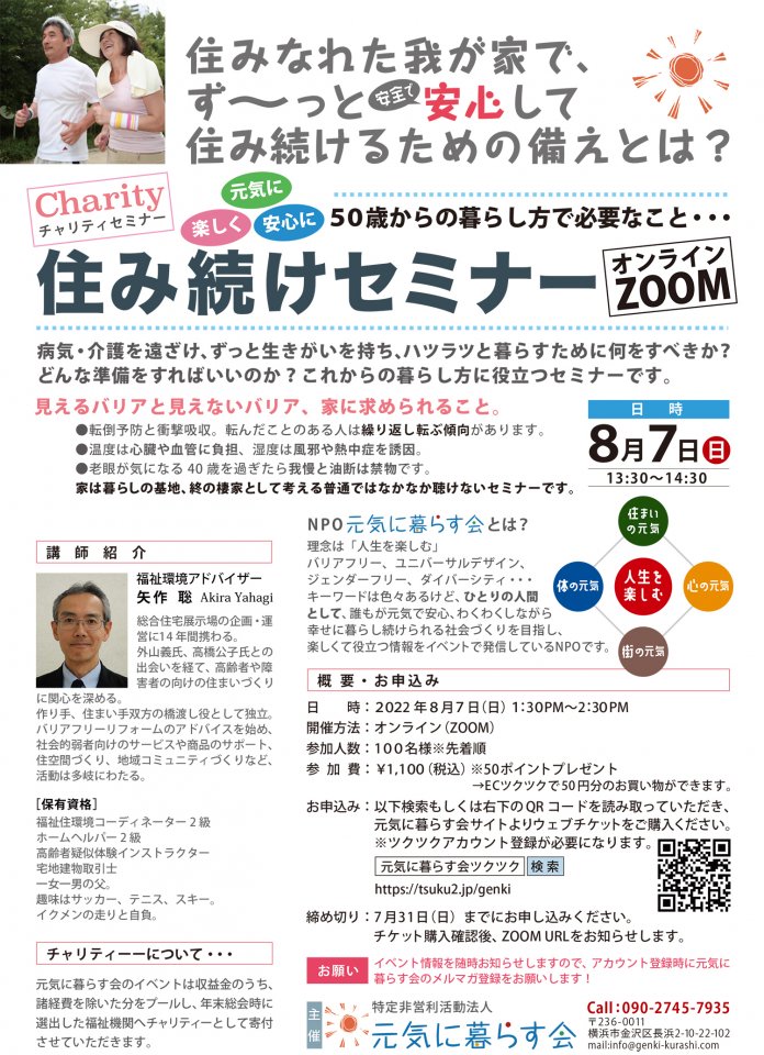理念である「一人の人間として人生を楽しむ」を実践するために、住まいの元気・体の元気・心の元気・街の元気・仕事の元気という5つの活動と介護、福祉・SDG’s・Wellbeing・お金・教育」という5つの視点から、イベンやセミナーを企画運営しています!
