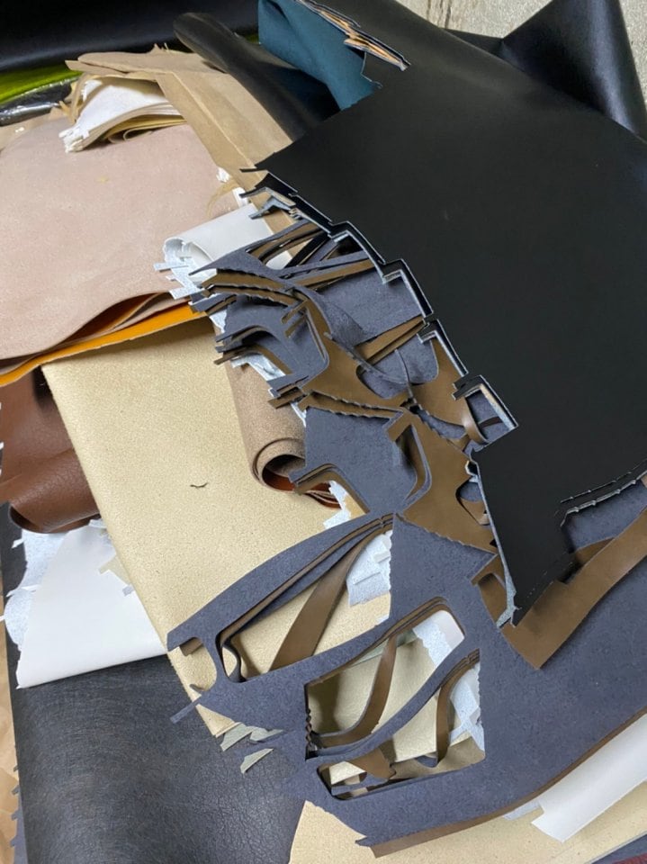 抜型と呼ばれる一つひとつが特注品の刃物で、素材をパーツごとの形に抜き出します。