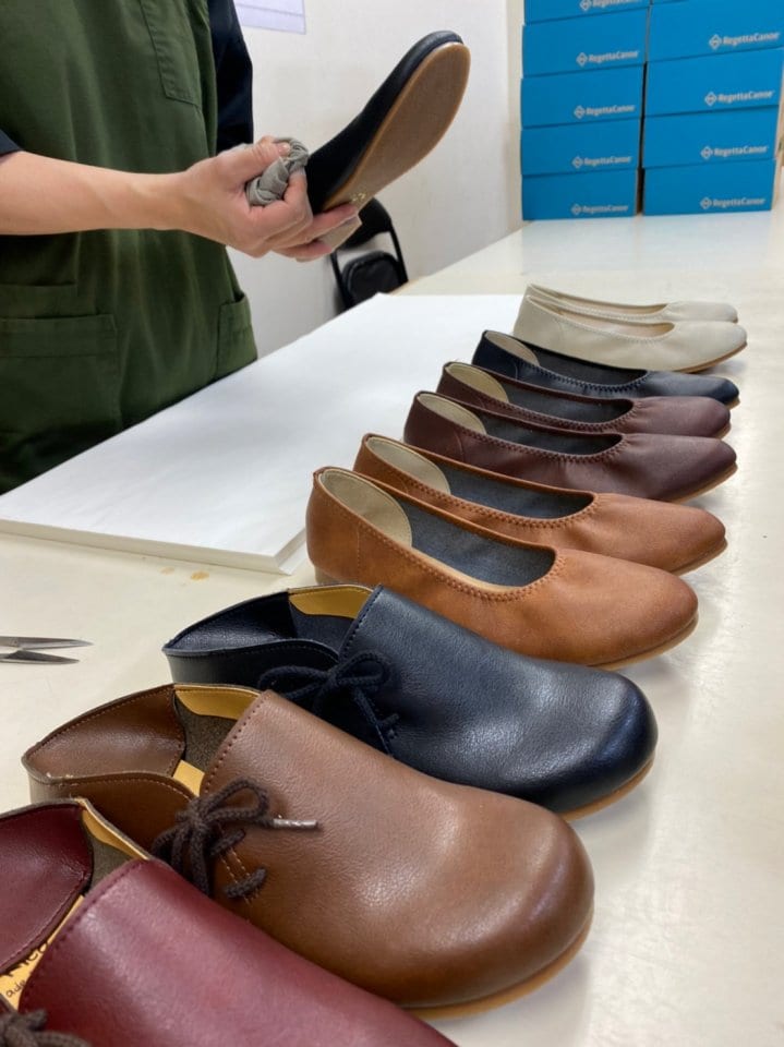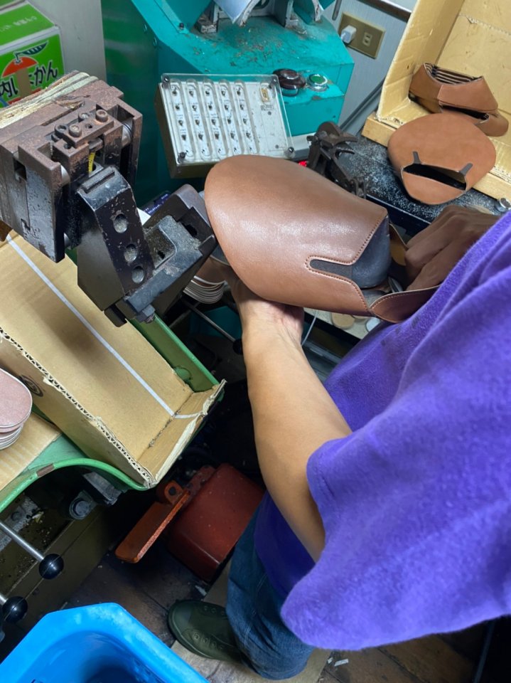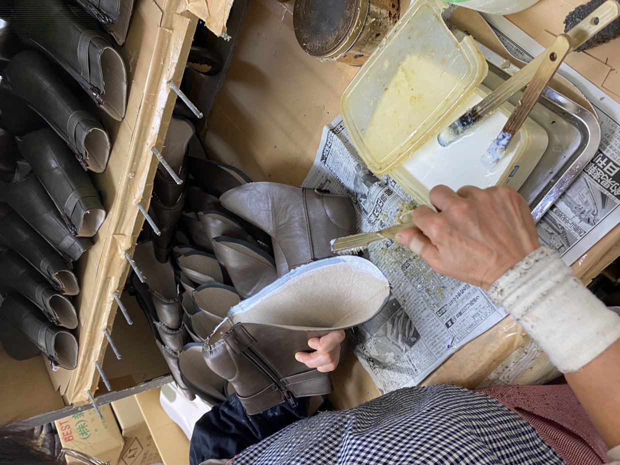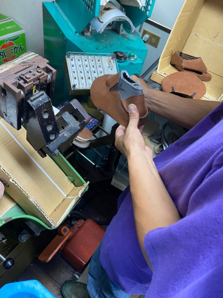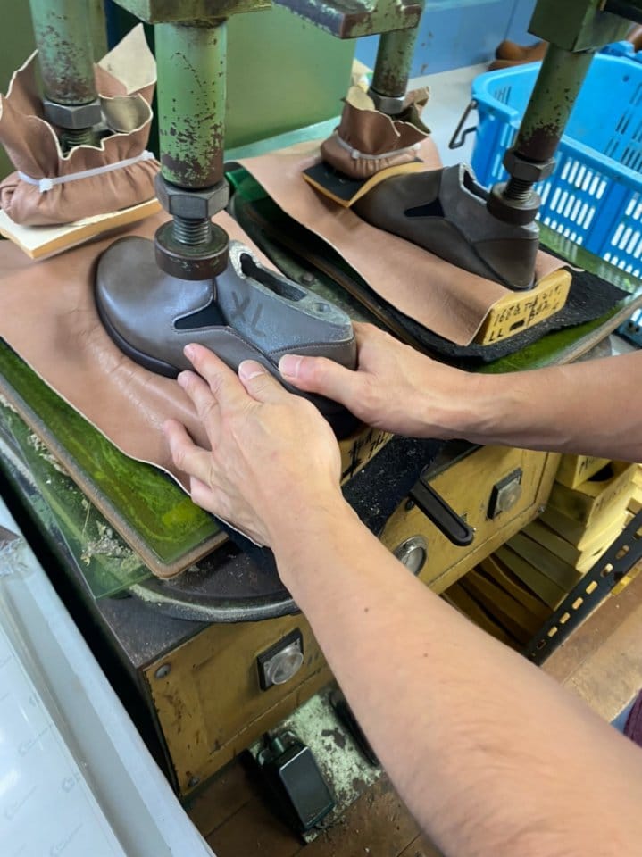 インソールとアウトソールを合わせ、全体に圧力をかけることで隙間なく接着され、靴の完成となります。