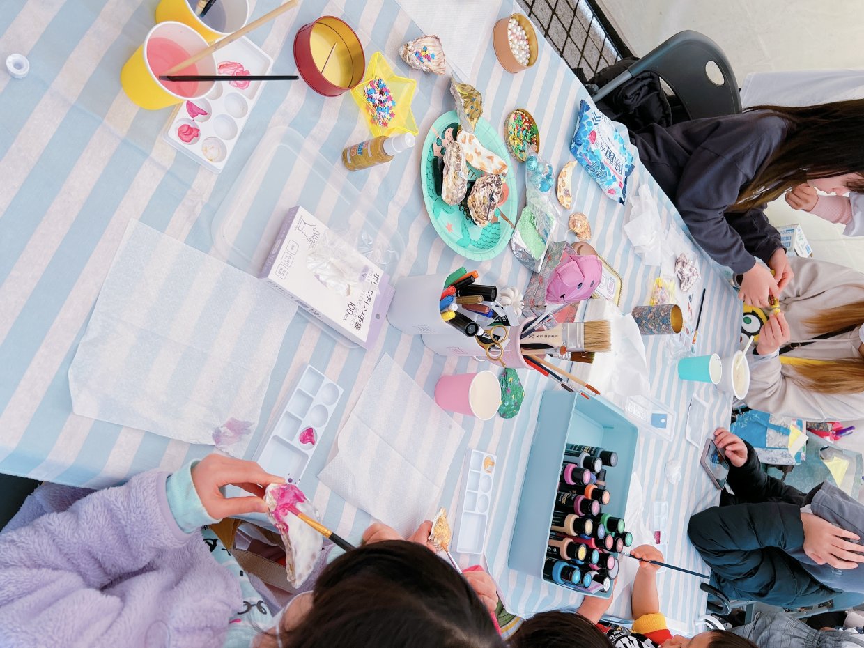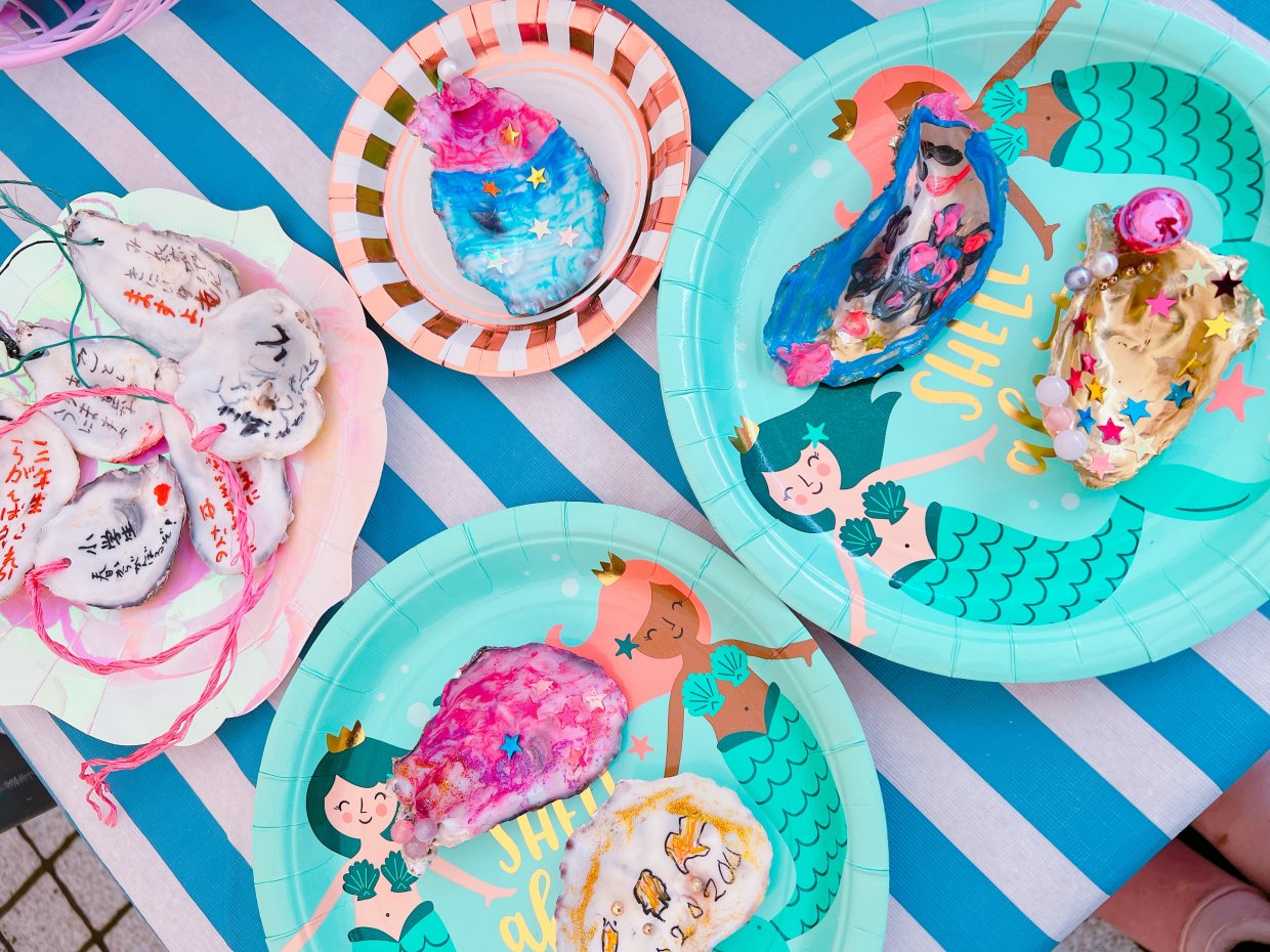 捨てられてしまう牡蠣の貝殻を使ってアクセサリーや小物を入れるトレイを作るワークショップです。