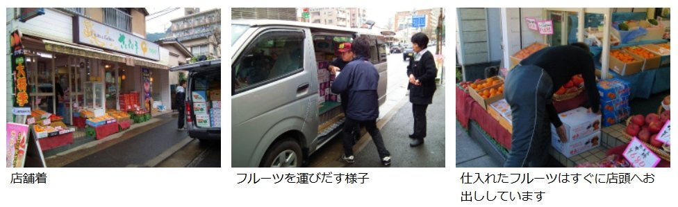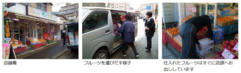 セリで仕入れたフルーツは、車から降ろして、すぐに店頭に並べています。
