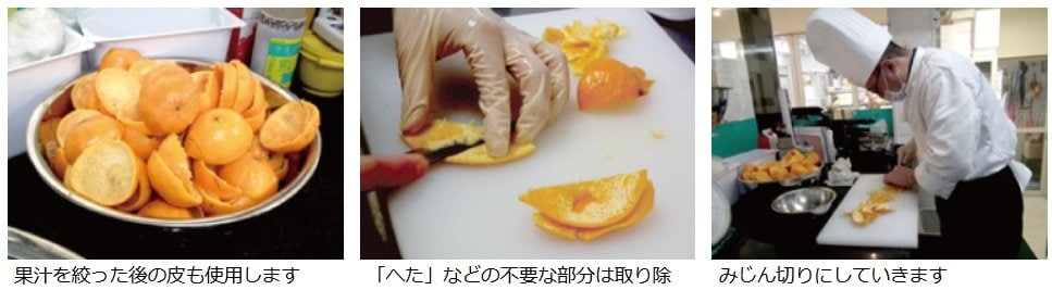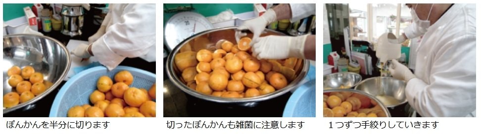 果汁を絞った後のぽんかんの皮を、1つ1つ手作業でみじん切りにしていきます。調理室の中いっぱいにぽんかんの香りが広がる位に皮には香料の効果があるのです。