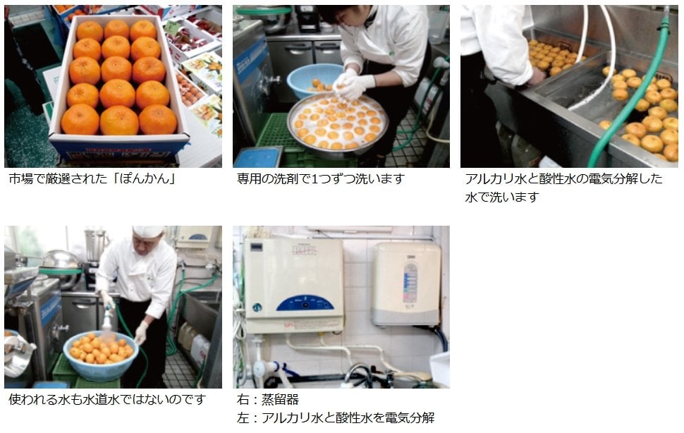 朝の市場で仕入れてきた『ぽんかん』を、専用の洗剤を入れて、1つずつ丁寧に洗っていきます。