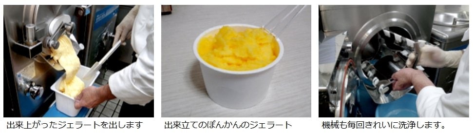 約15分後、機械からぽんかんジェラートが出来上がってきます。細かくきざんだ皮もまんべんなく入っています。