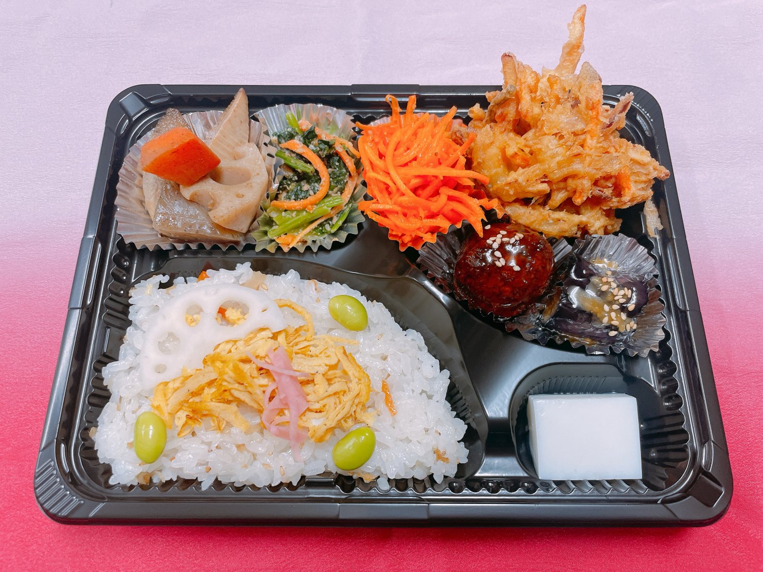 筑前煮・胡麻和え・かきあげ・肉団子・茄子田楽・かきあげ・寒天
