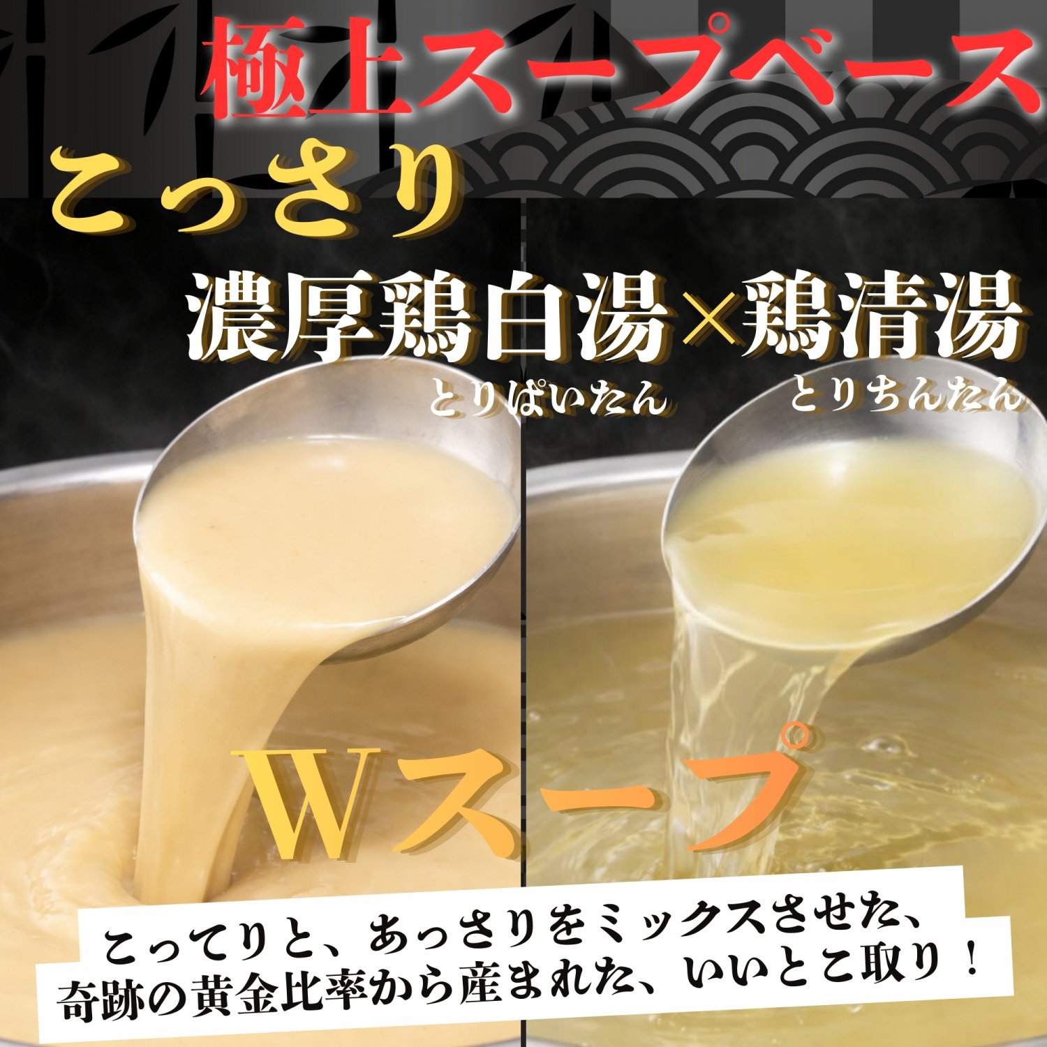 こってりと、あっさりをミックスさせた、奇跡の黄金比率から産まれた、いいとこ取りのWスープ!