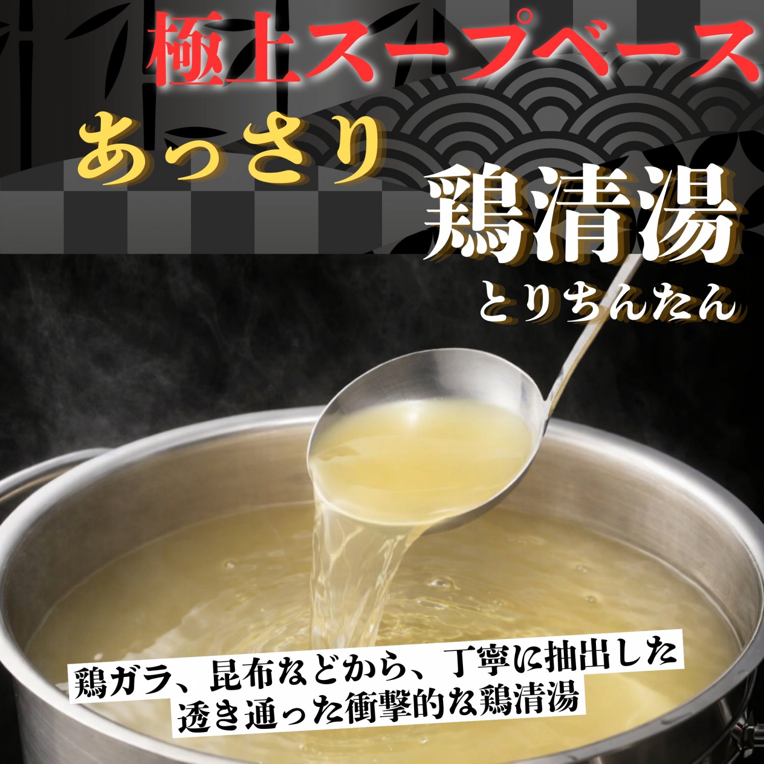 鶏ガラや昆布などから、弱火でじっくり丁寧に旨味だけを抽出した、透き通った衝撃的な鶏清湯