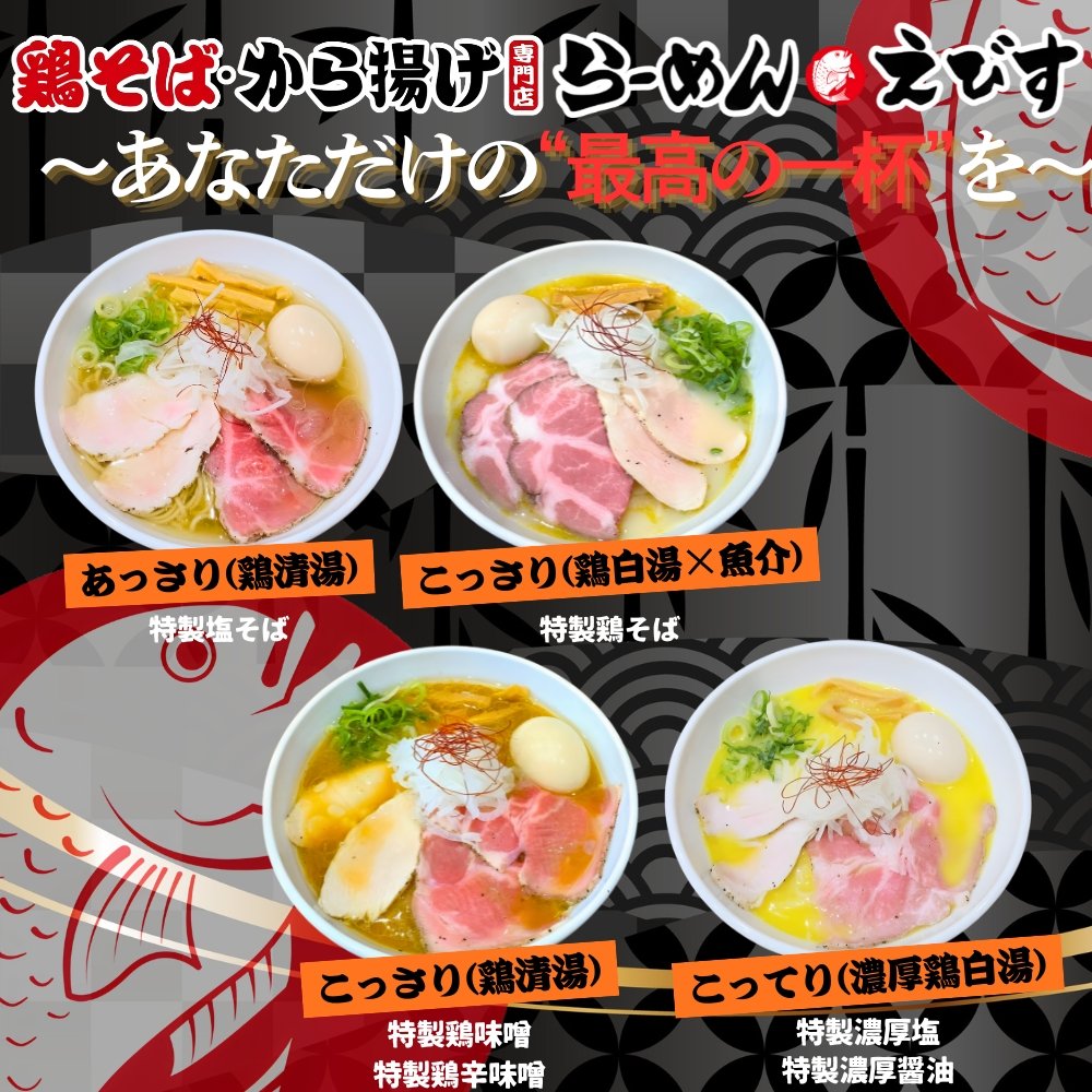 愛知と岐阜に複数店舗を展開する、鶏そば・から揚げ専門店「らーめん えびす」