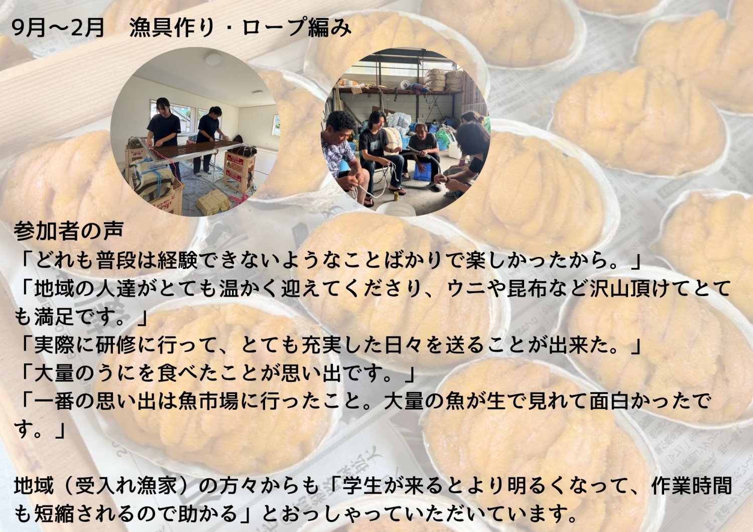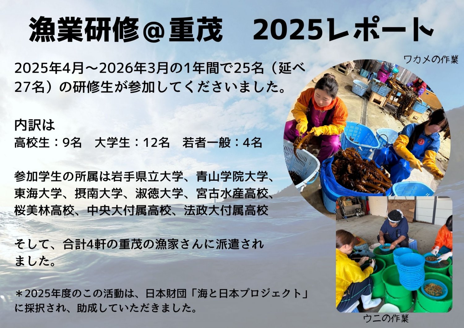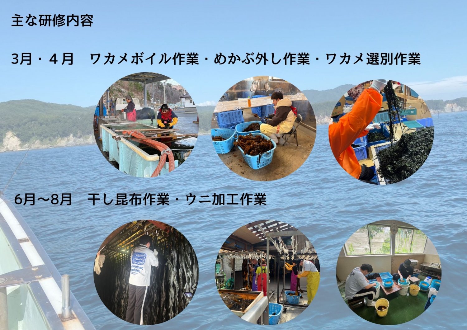 3月~7月まで、重茂地域では漁業の最盛期を迎えます。その時期に実際に漁家に訪れて、漁師さんたちと作業をする漁業研修を行います。