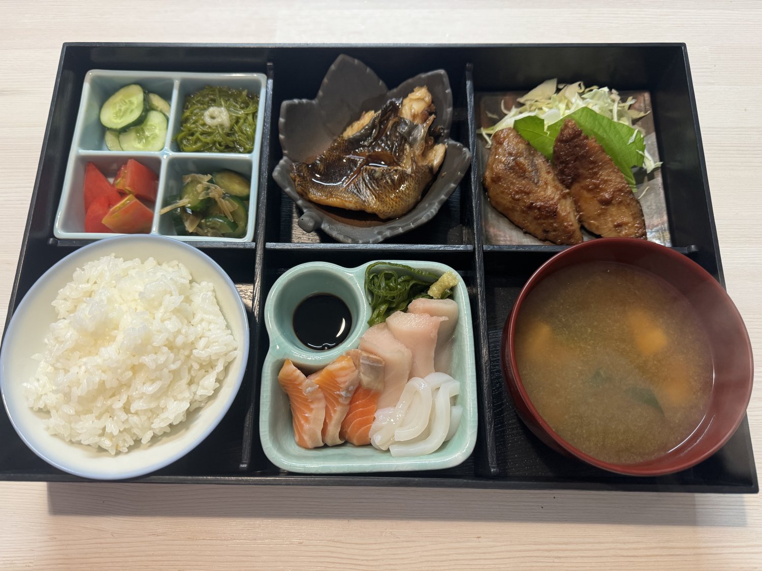 There are bacically rice, soup, main dish (Sashimi etc.) and a couple of side dishes for dinner.