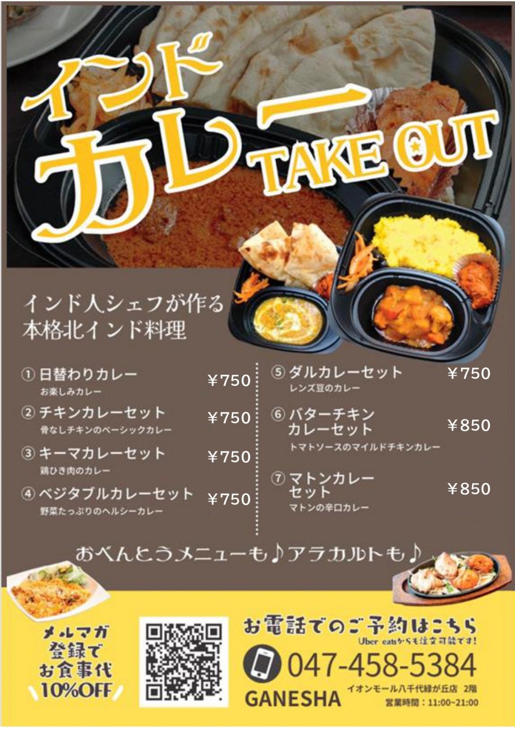ガネーシャのアラカルトメニューは全品テイクアウトできます。