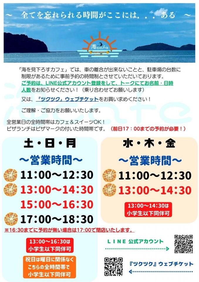 海を見下ろすカフェでは来店の際には立地条件の為、ご利用時間1時間30分の時間制となっております。