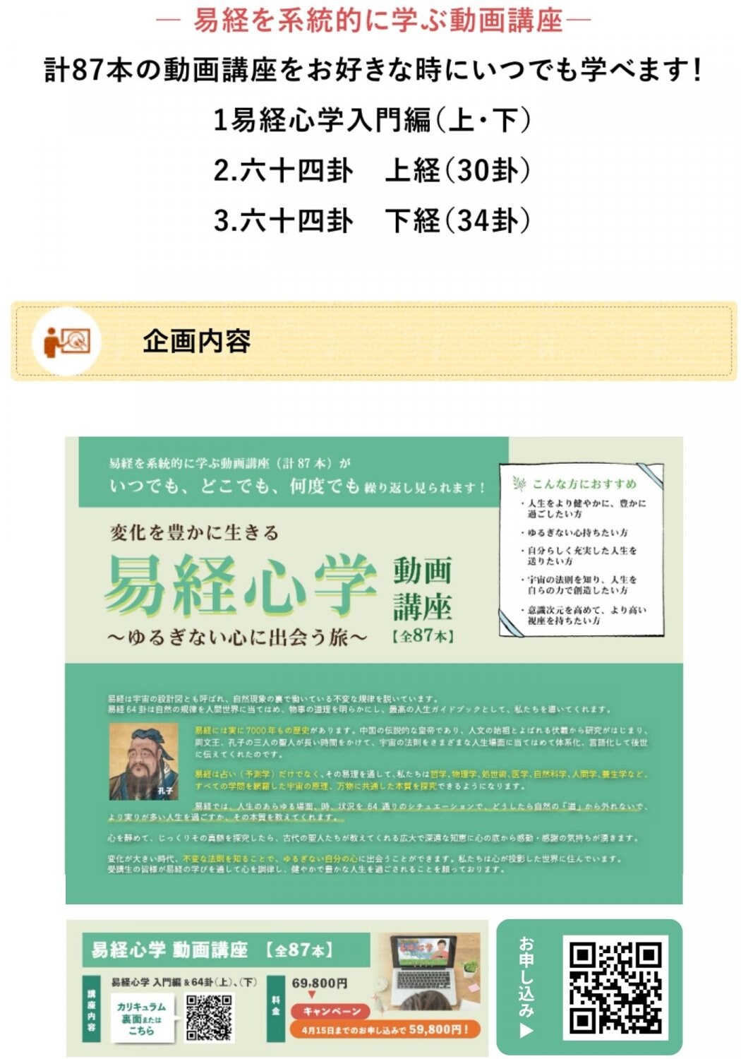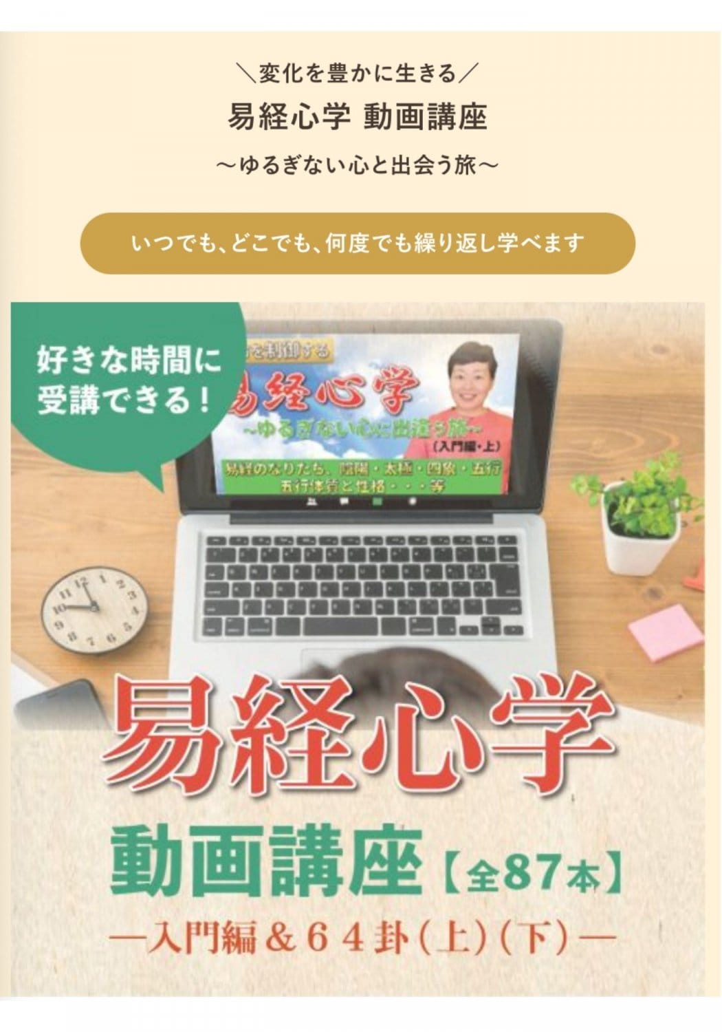 心を静めて、じっくりその真髄を探究したら、古代の聖人たちが教えてくれる広大で深遠な知恵に心の底から感動・感謝の気持ちが湧きます。変化が大きい時代、不変な法則を知ることで、ゆるぎない自分の心に出会うことができます。私たちは心が投影した世界に住んでいます。受講生の皆様が易経の学びを通して心を調律し、健やかで豊かな人生を過ごされることを願っております。