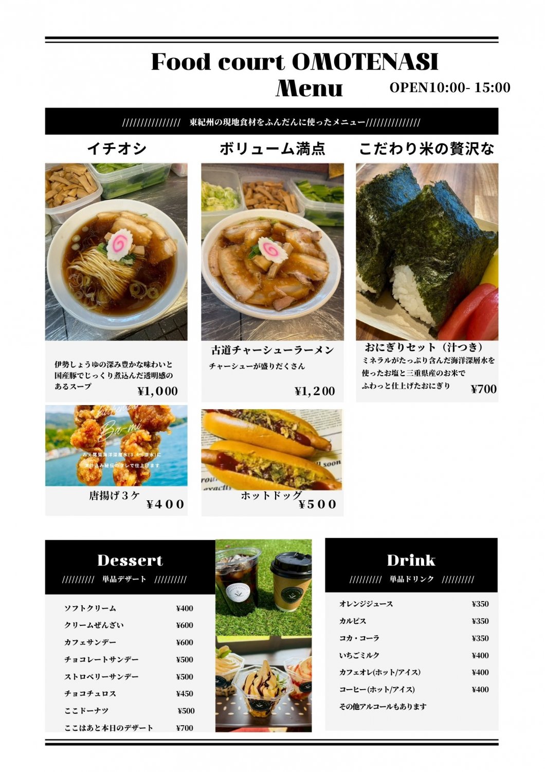 フードコートOMOTENASIは、自然豊かな環境の中で、地元の味覚を存分に楽しめる癒しの空間です。名物の「古道ラーメン」をはじめ、軽食やカフェメニューが充実しており、訪れるたびに新しい味わいを発見できます。さらに、土日祝限定で提供される東紀州 尾鷲の新鮮な地魚の刺身定食専門店「ほんじつのさかな」も出店。
