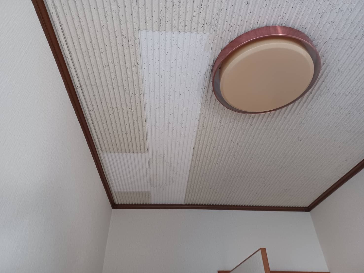 雨漏りが止まっている事が確認出来ましたので、最後に雨漏りで穴の開いた天井を張替え、染みになっている部分は色を合わせて塗装しました。