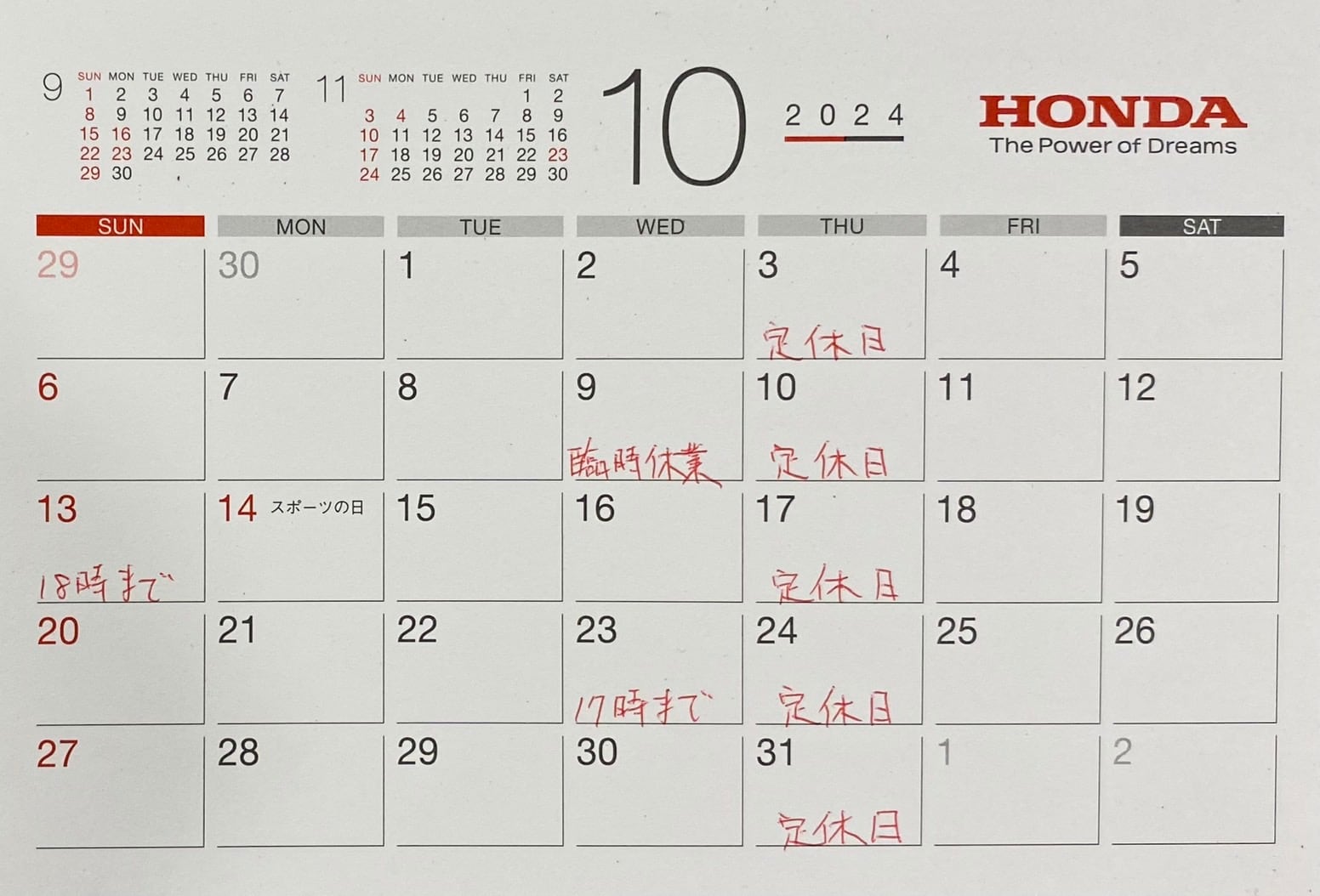 10月の定休日のお知らせ