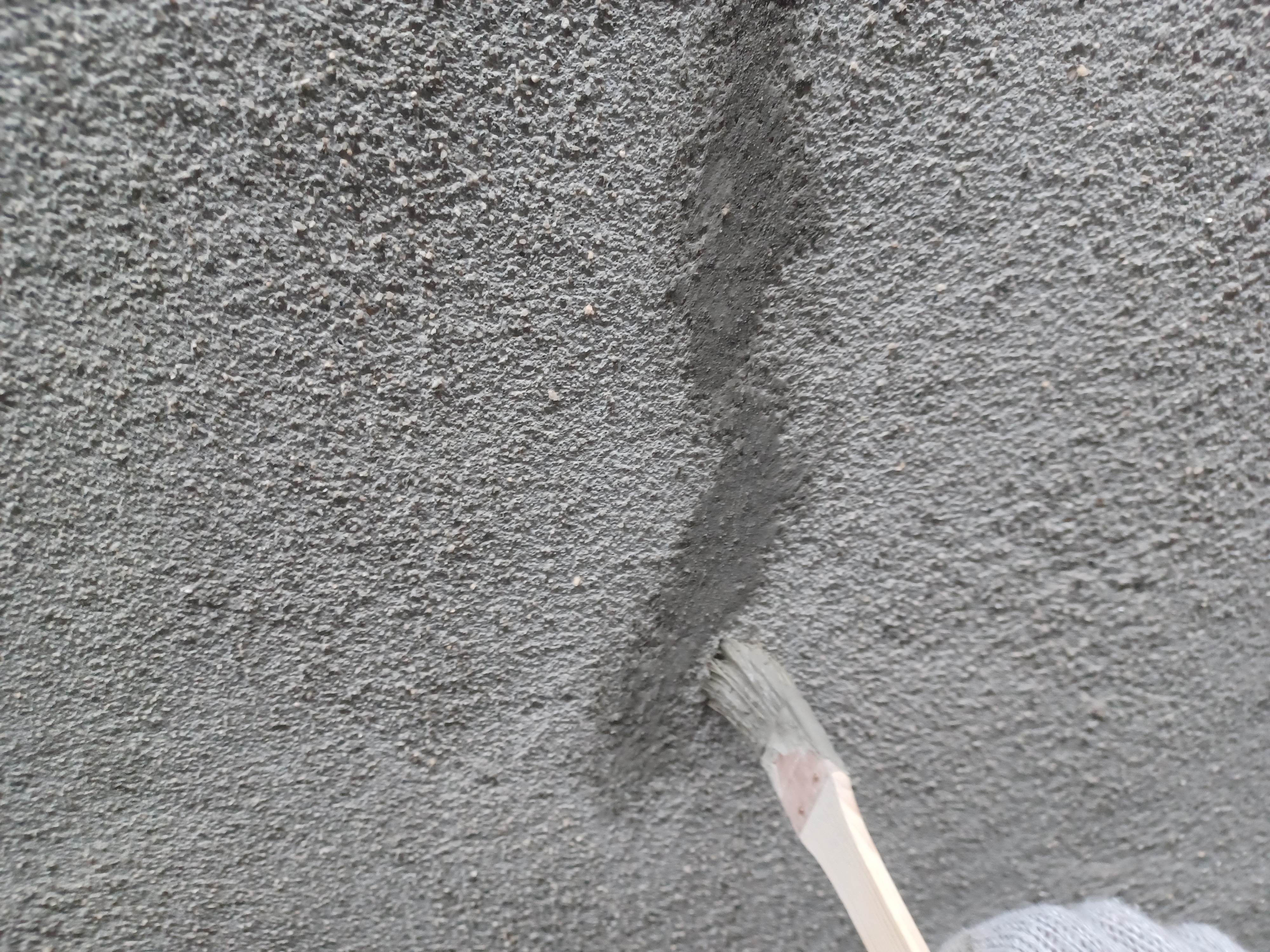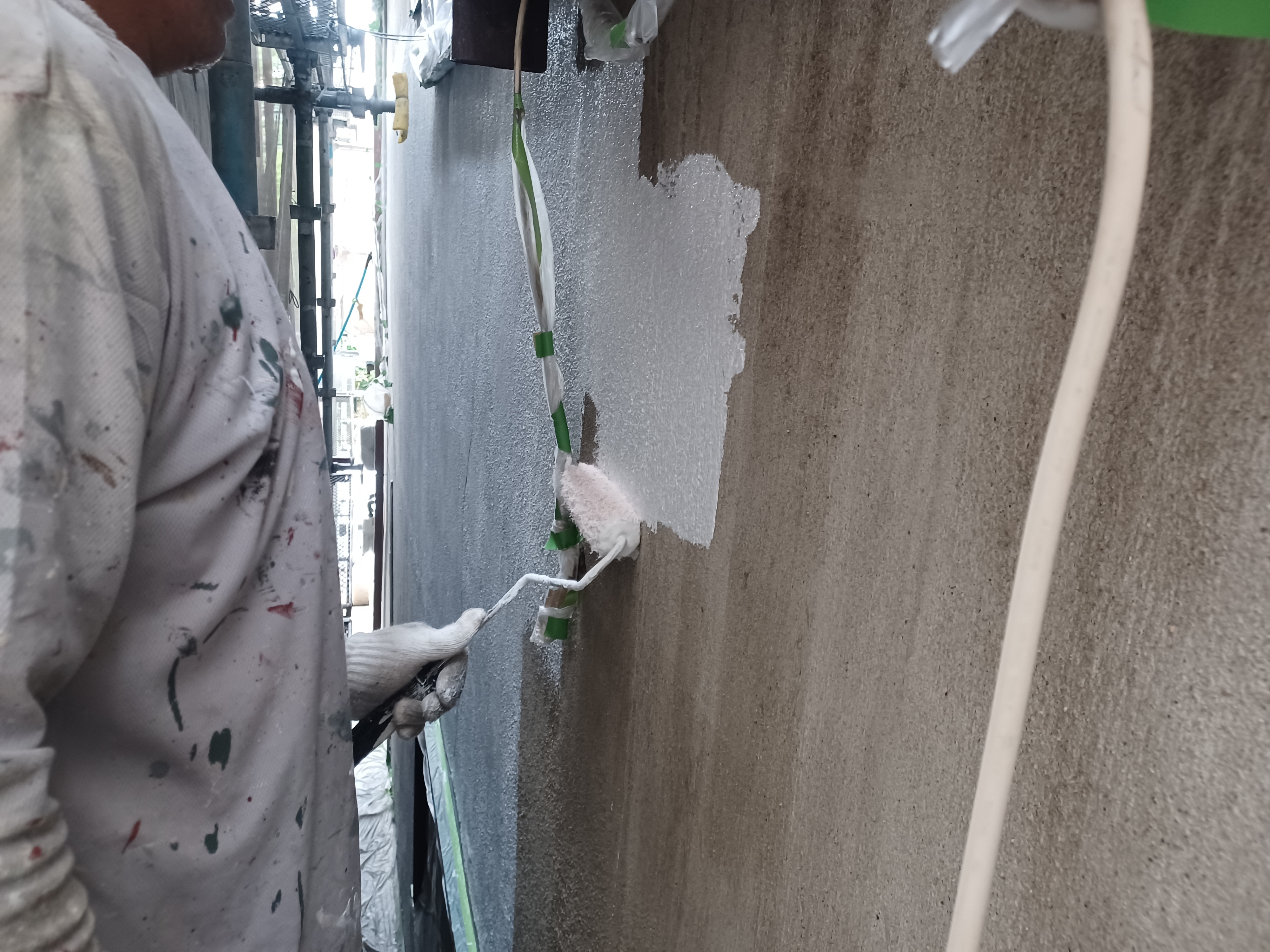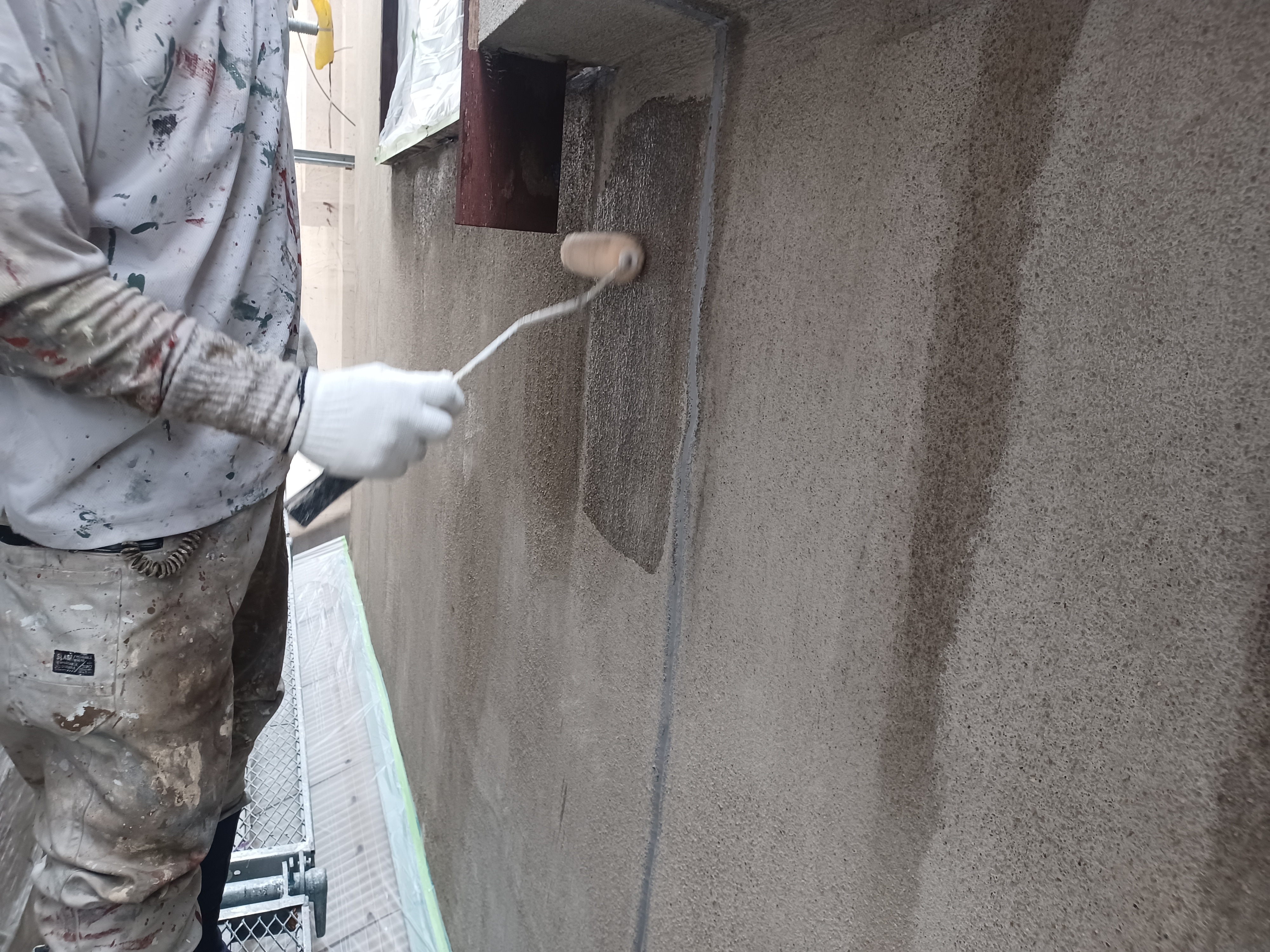 外壁塗装では塗装前に高圧水洗浄を行いますが今回は素地が50年経っているモルタルでしたので、表面を手で擦ると簡単にモルタルが剥がれ落ちる状態でしたので、浸透性シーラーを塗布して表面を固めてから微弾性フィーラーを塗布しました。