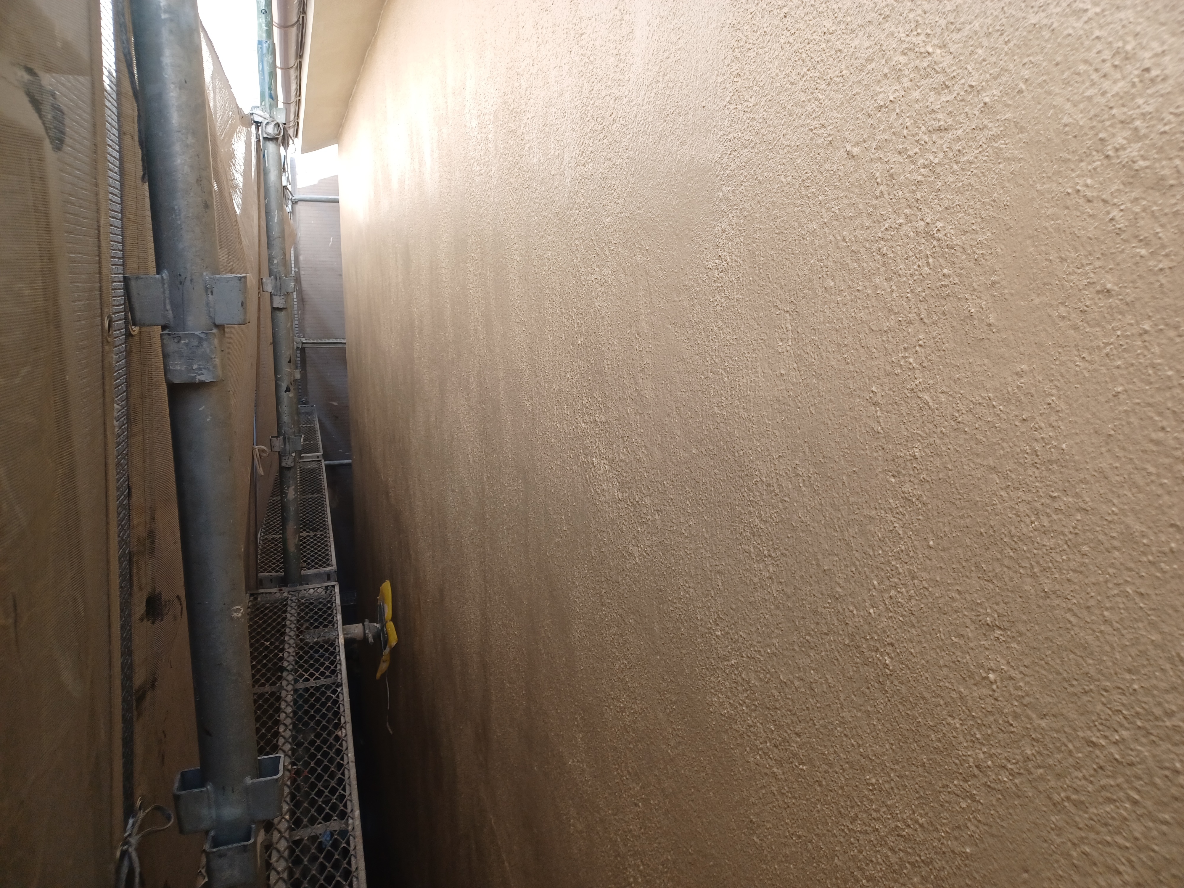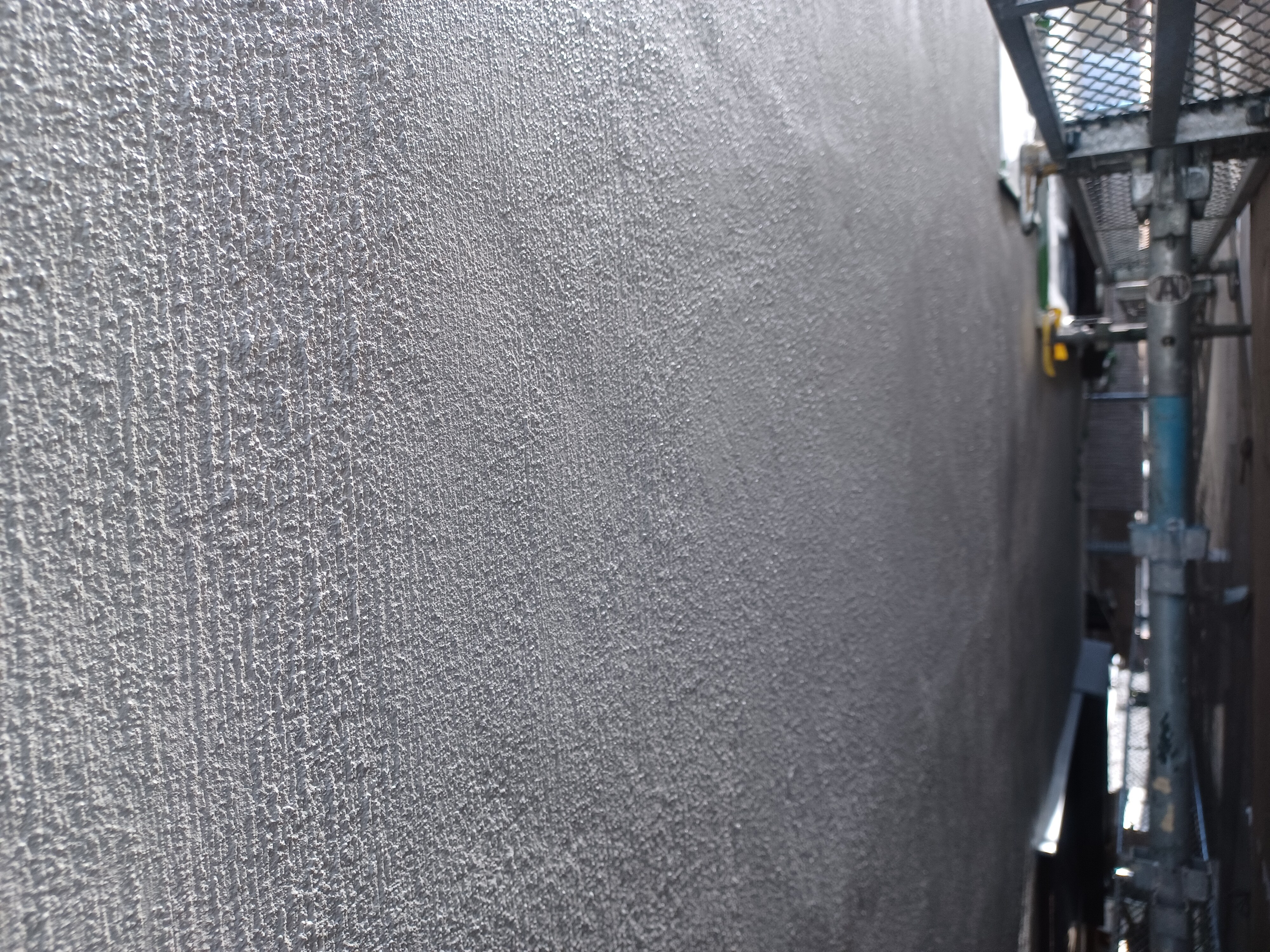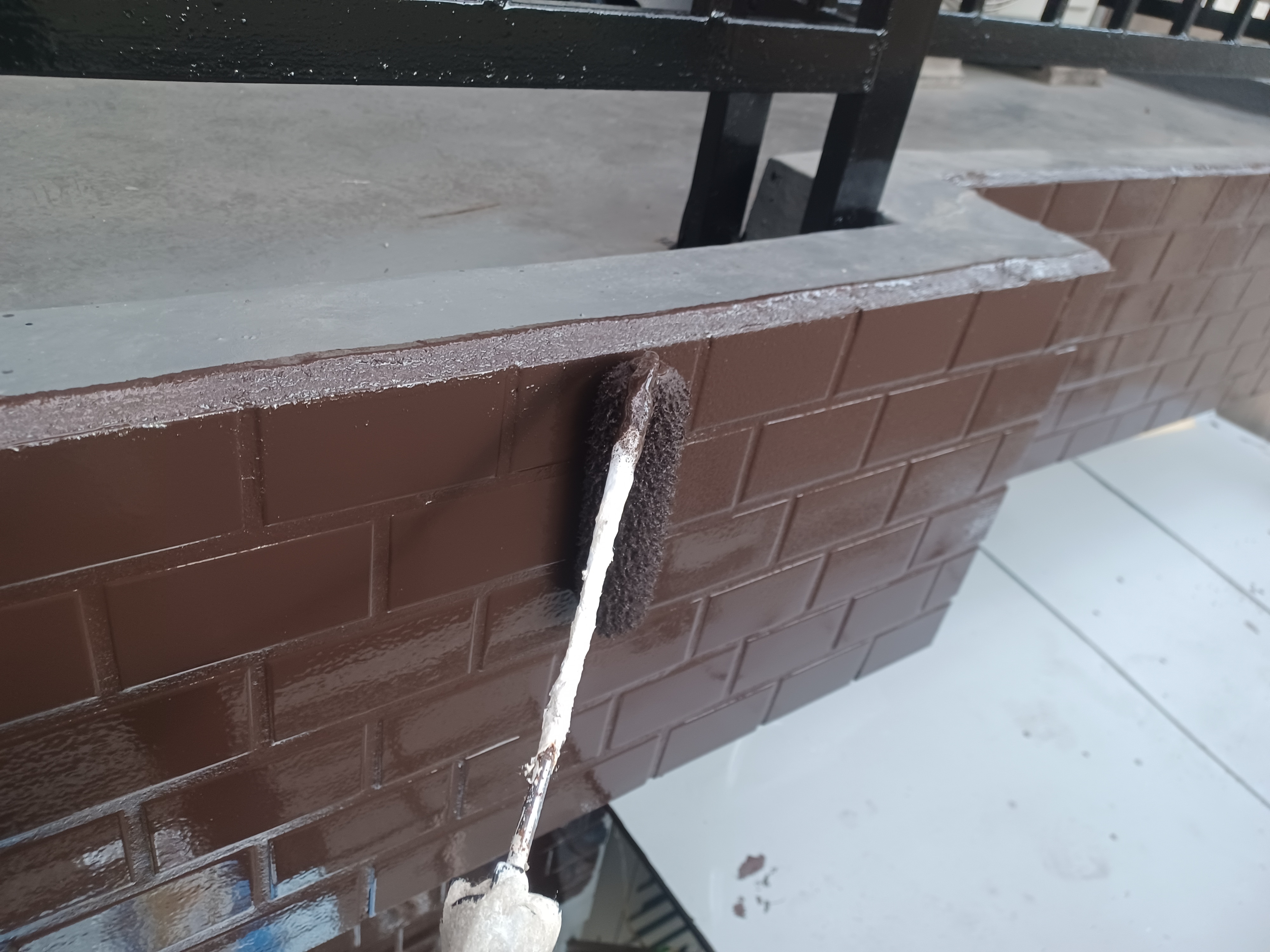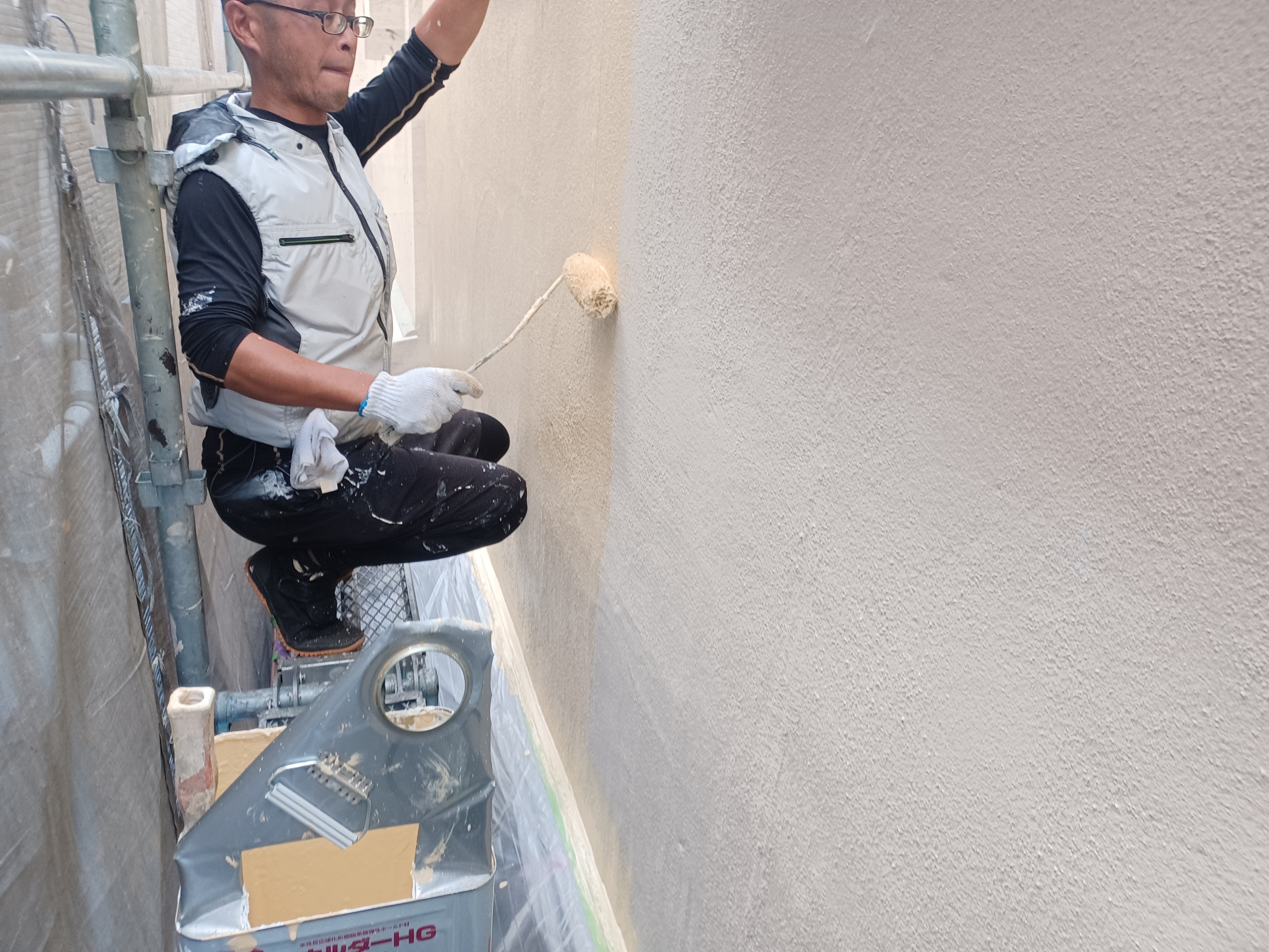 外壁塗装では塗装前に高圧水洗浄を行いますが今回は素地が50年経っているモルタルでしたので、表面を手で擦ると簡単にモルタルが剥がれ落ちる状態でしたので、浸透性シーラーを塗布して表面を固めてから微弾性フィーラーを塗布しました。