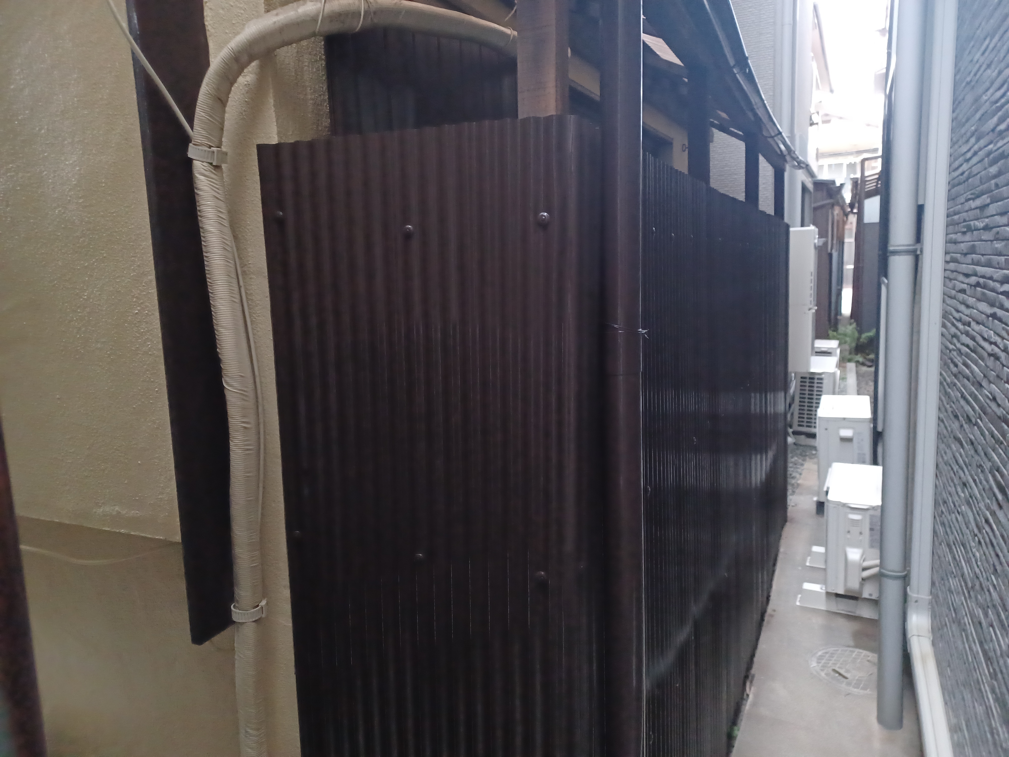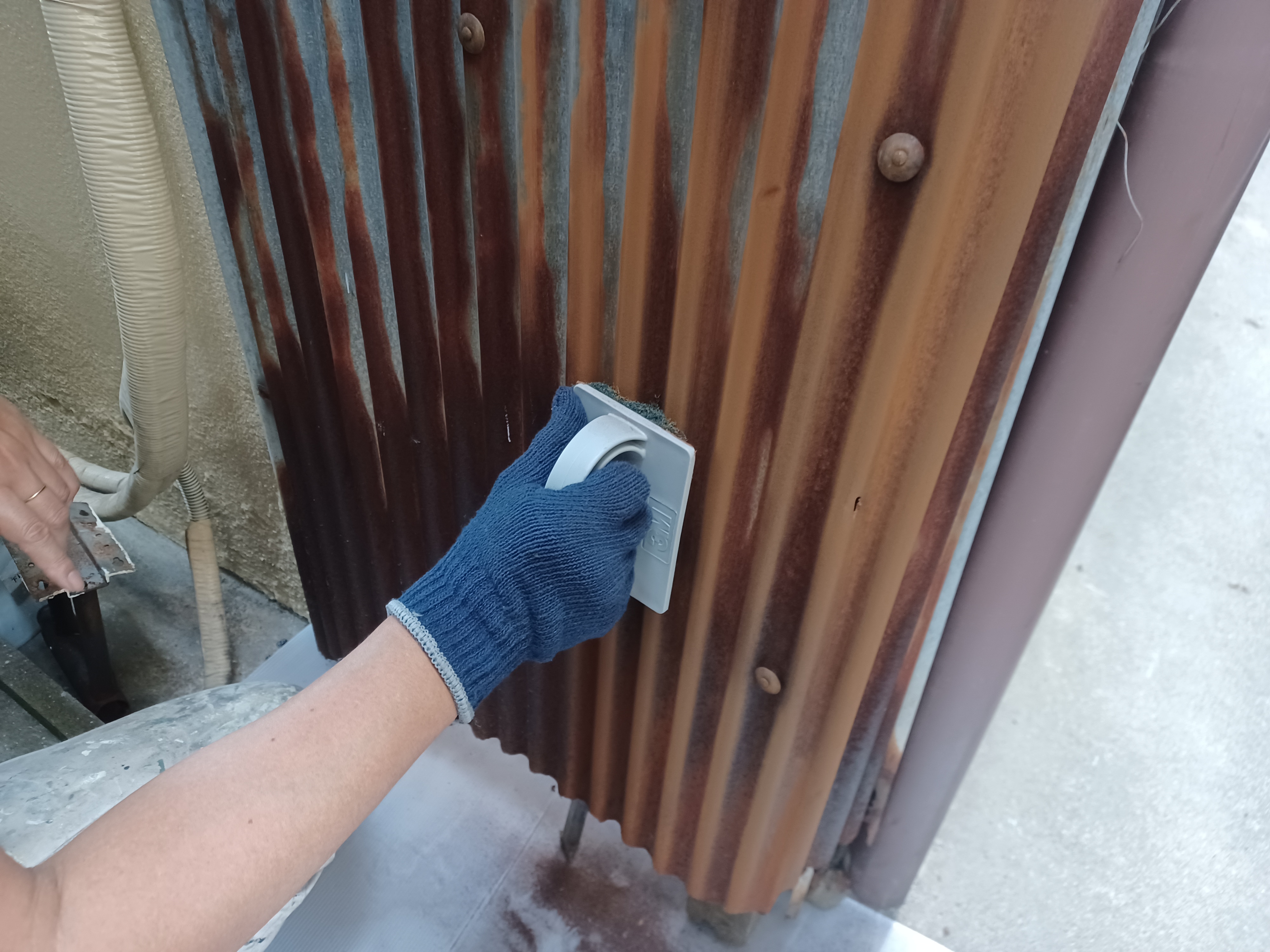 波トタンはケレン後にさび止め、中塗り、上塗りの計3回塗りですが、見違えるほどに綺麗になります。