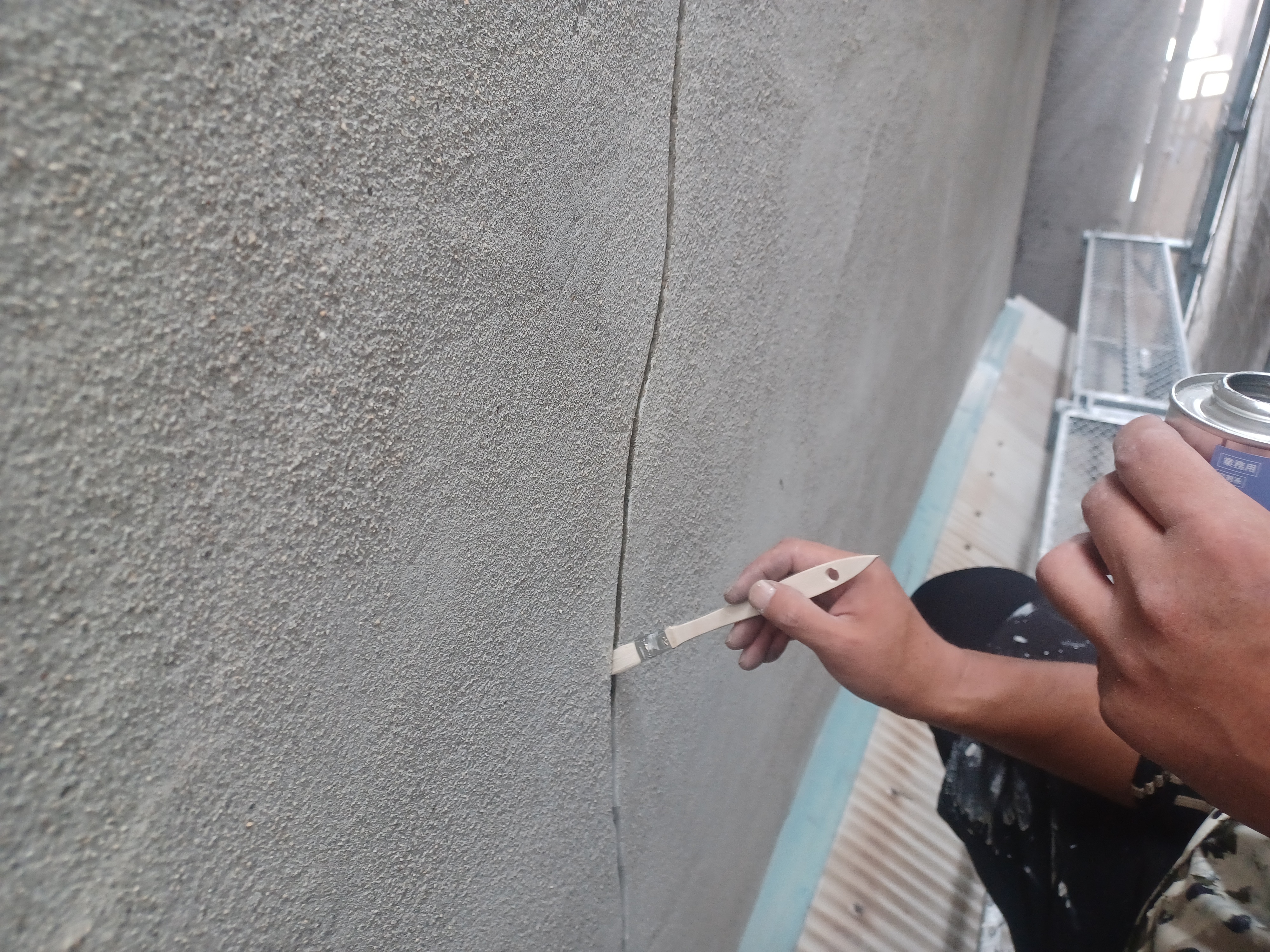 先ずは外壁のモルタルに生じているひび割れ(クラック)の補修から行っていきました。