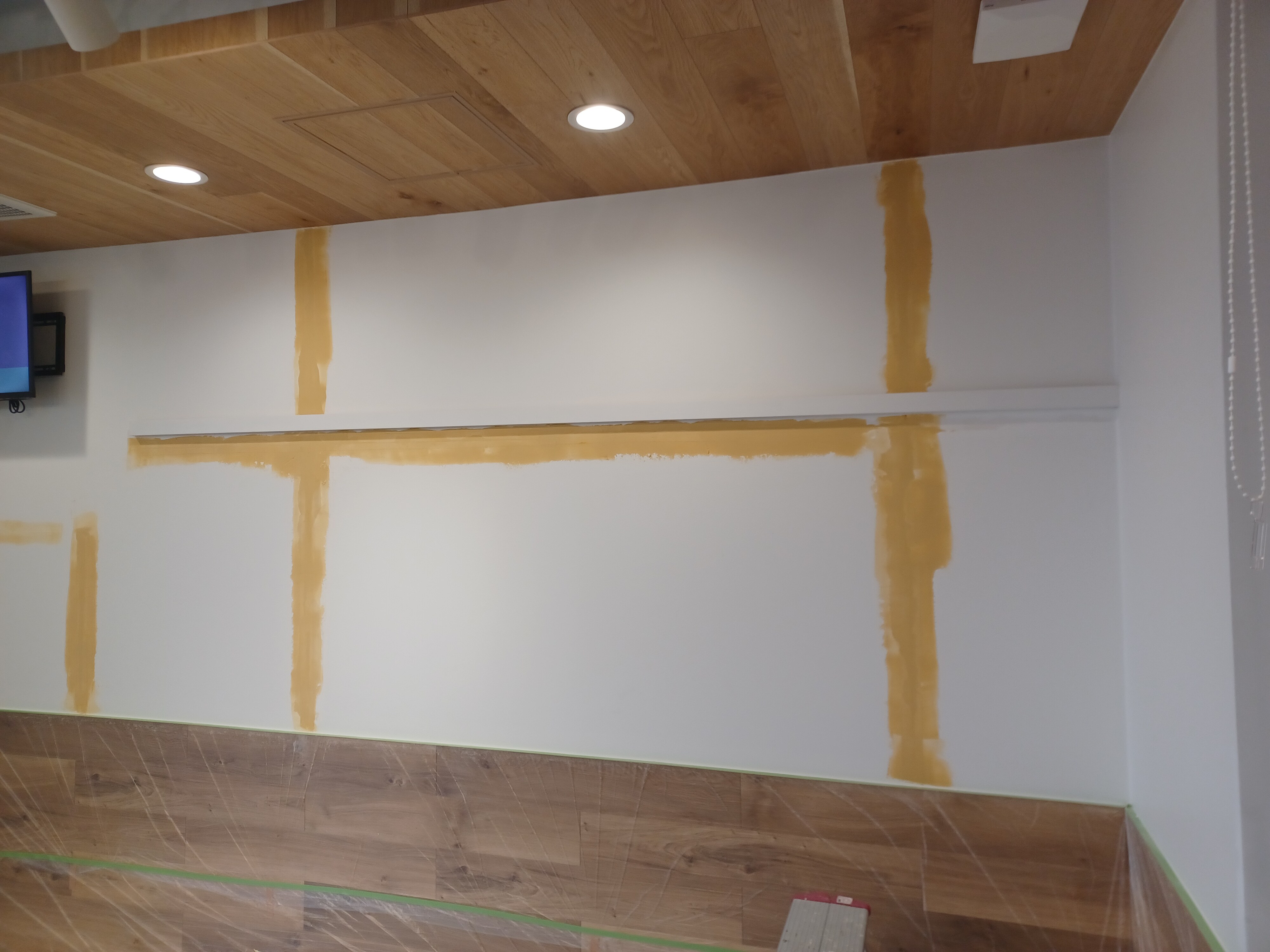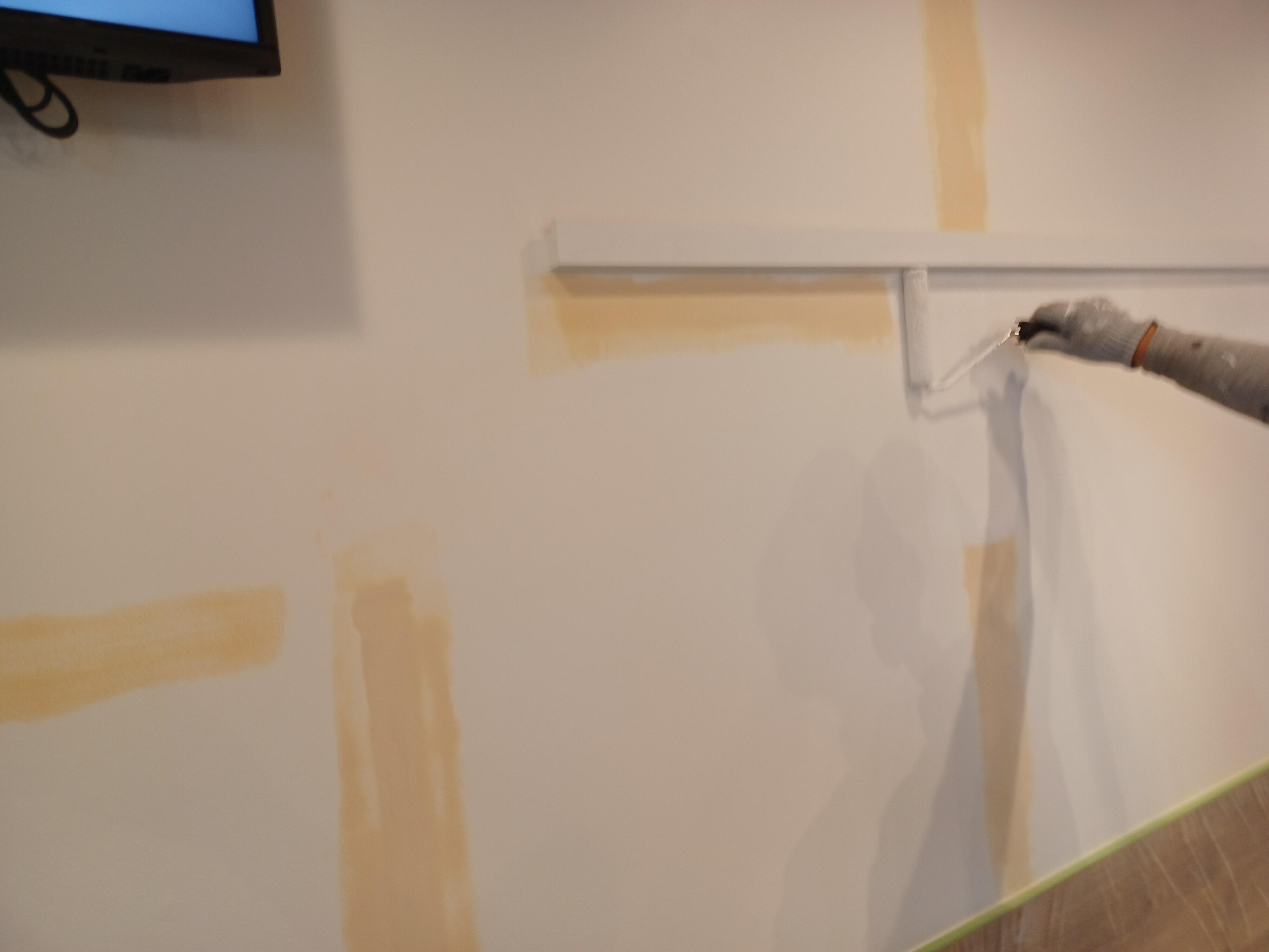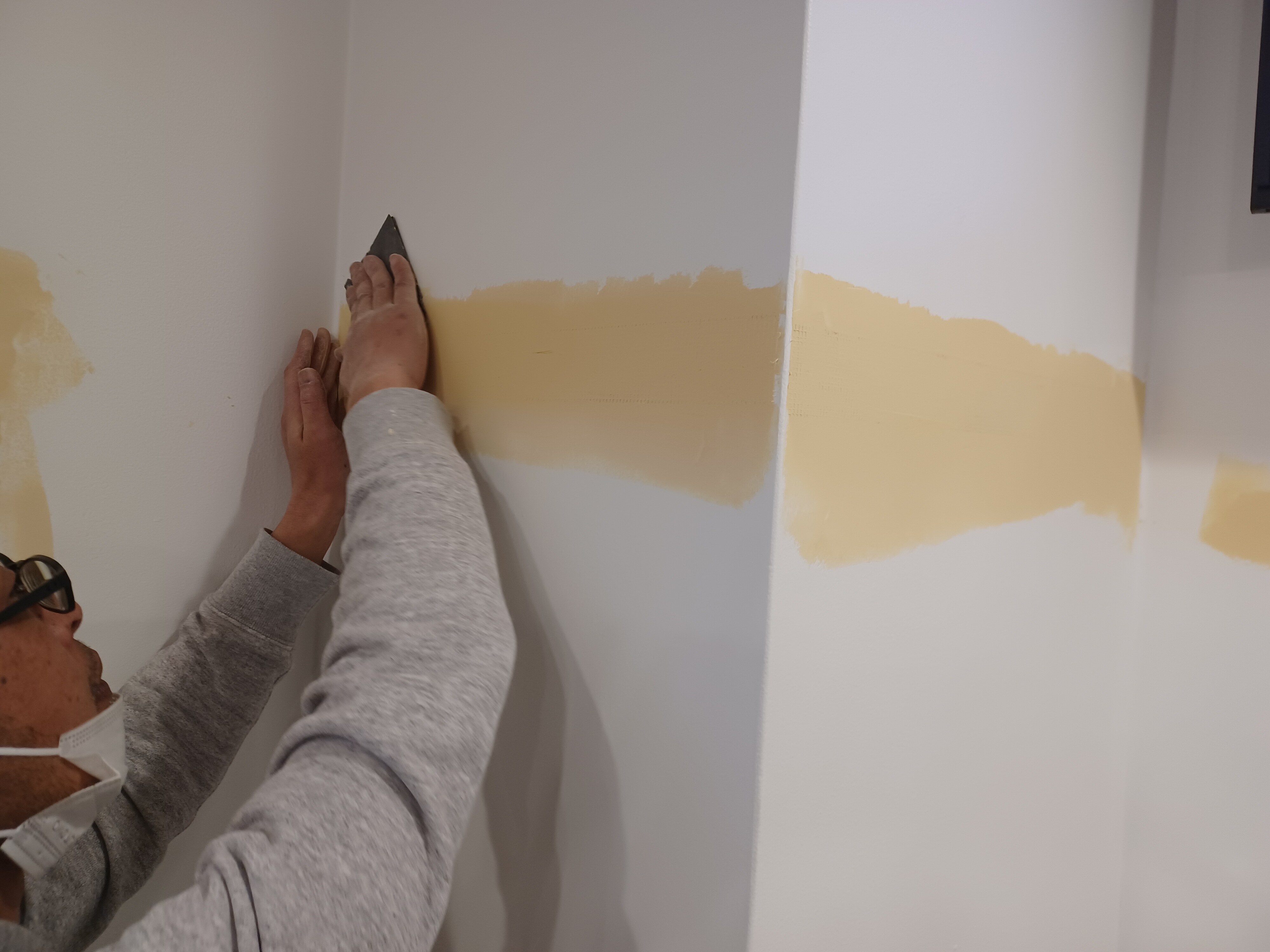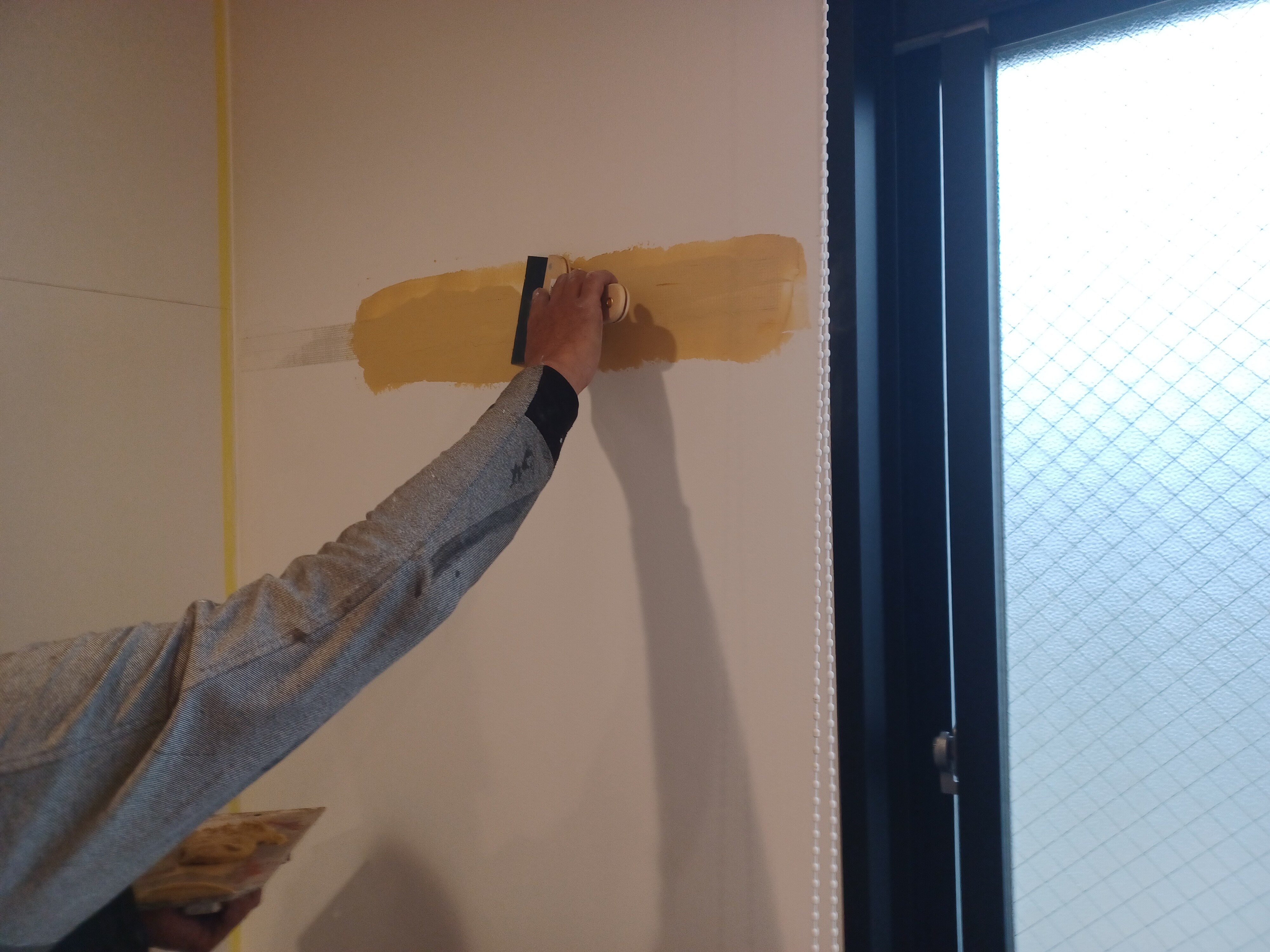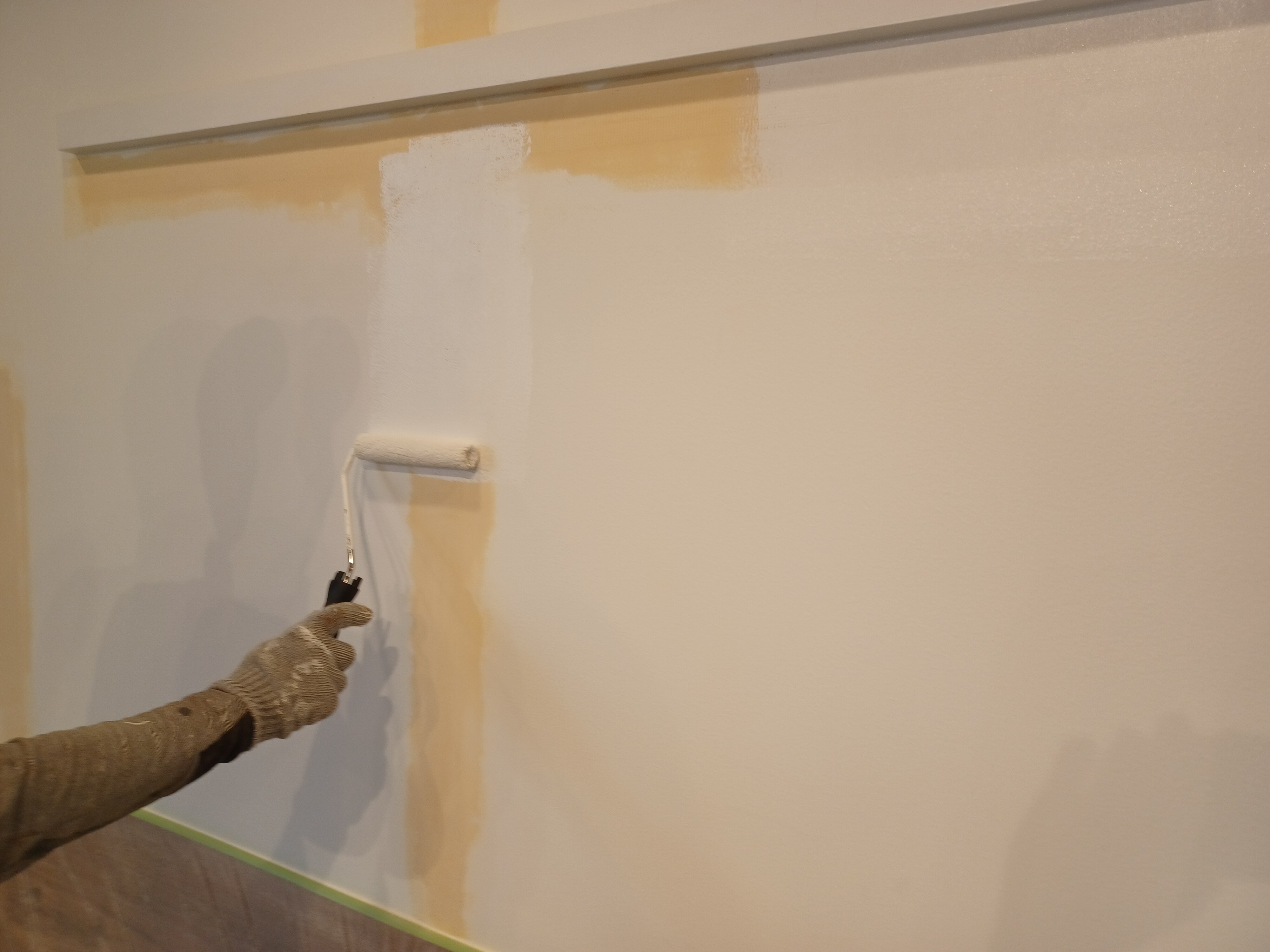 パテをした部分はツルツルになり、既存の壁と肌が変わりますのでパテをした部分を塗装して、吸い込みを止めるという事と肌を合わせるという作業を行いました!