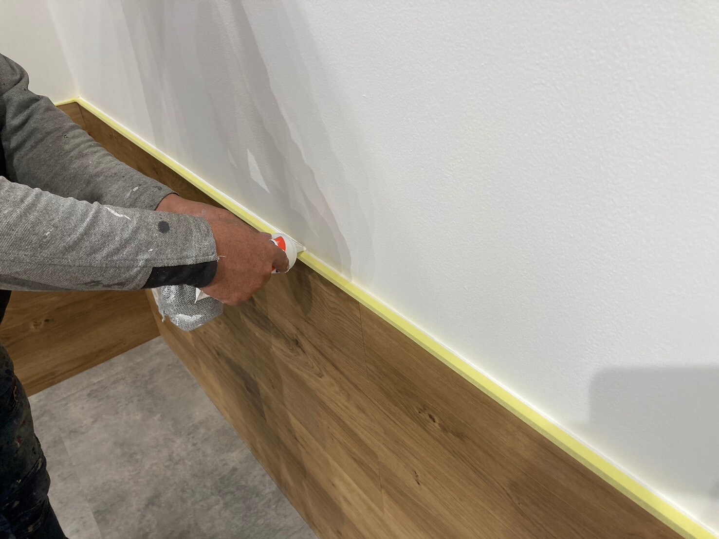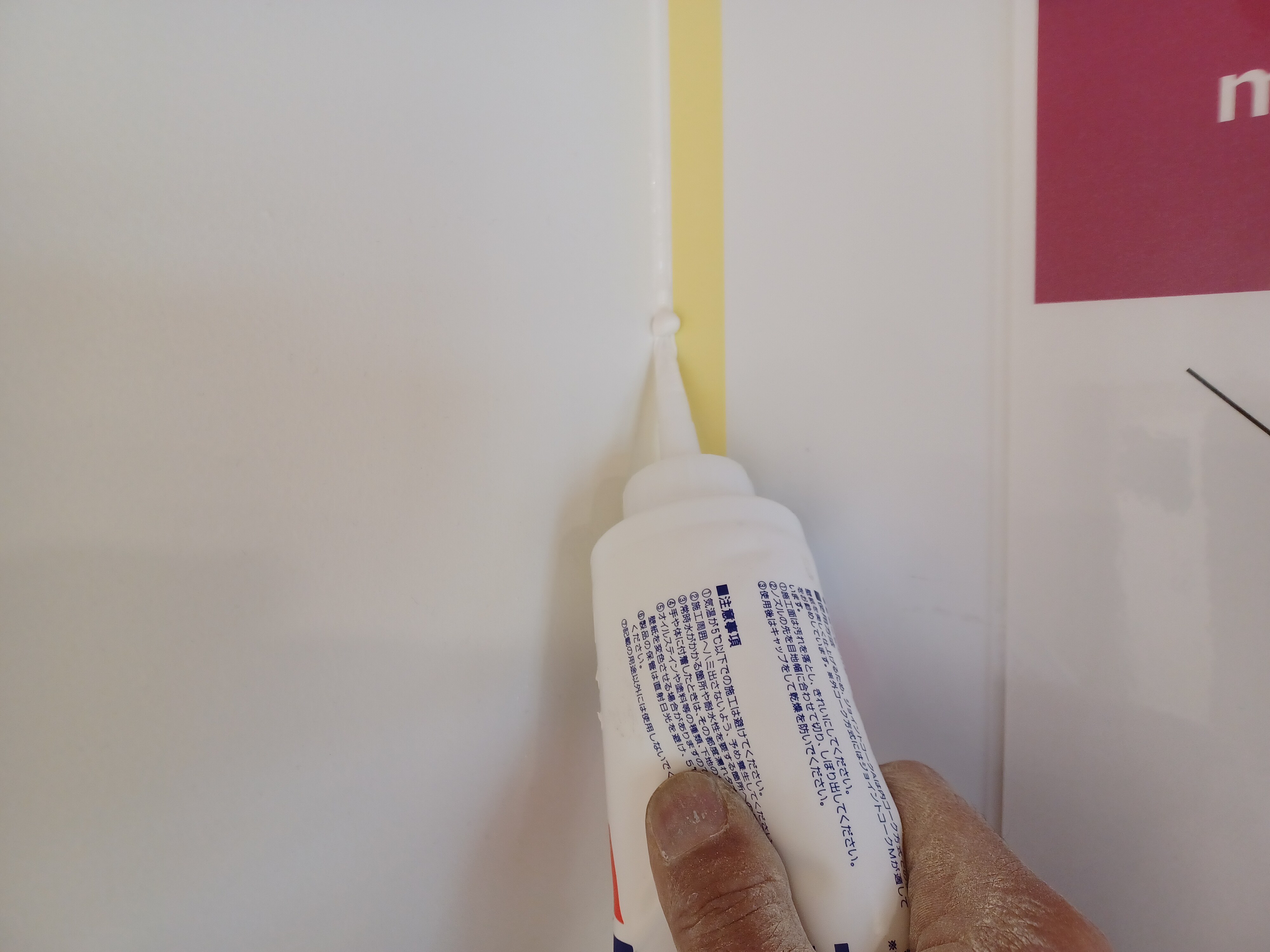 この処理は内装の塗装では必要な作業で、コーキングを打ってからきちんと乾燥していない状態で塗装をすると塗料の方がコーキングより乾燥が早いですので、乾燥する段階で塗膜が閉まる際に割れてしまいます。