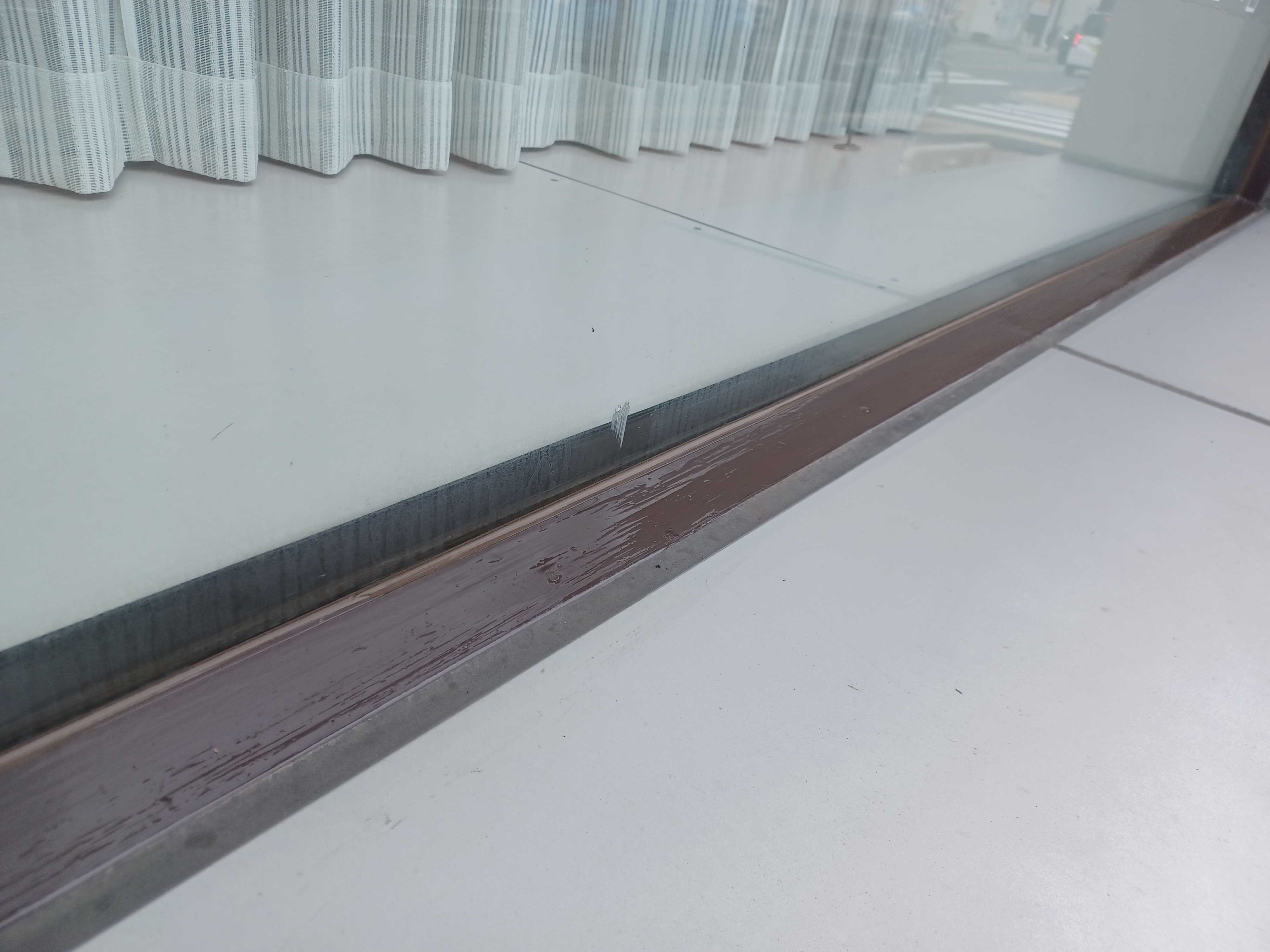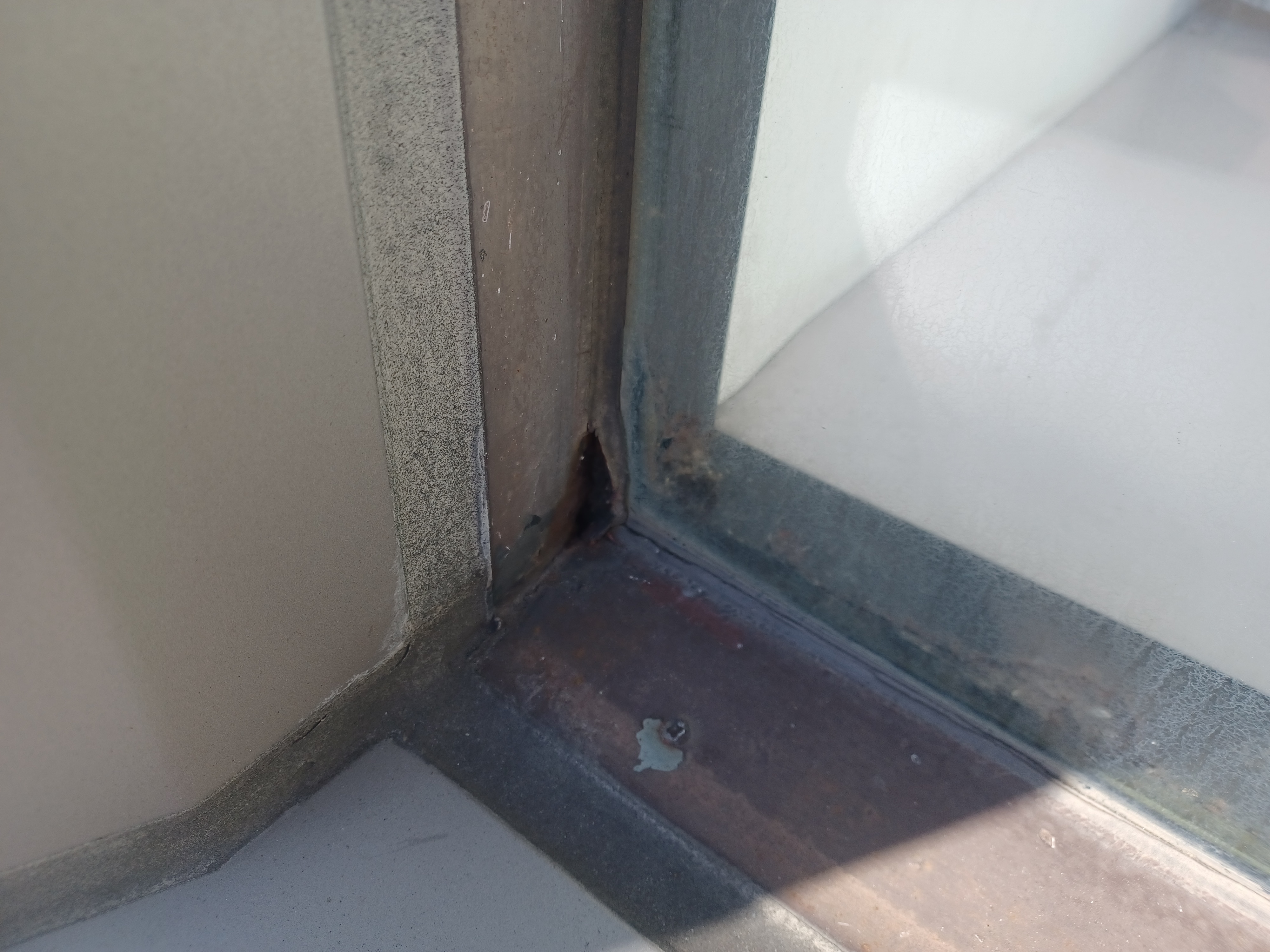 信用金庫様の大きな窓のスチール窓枠が腐食により、所々で穴があいている状態でご相談をいただきました。
