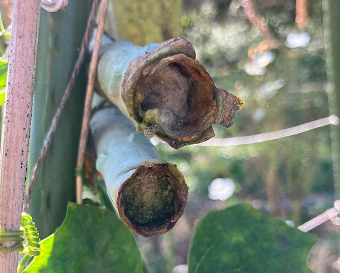 支柱の錆びて折れたやつ、虫たちのお宿用に設置してたら、ご利用頂いている感じ!?