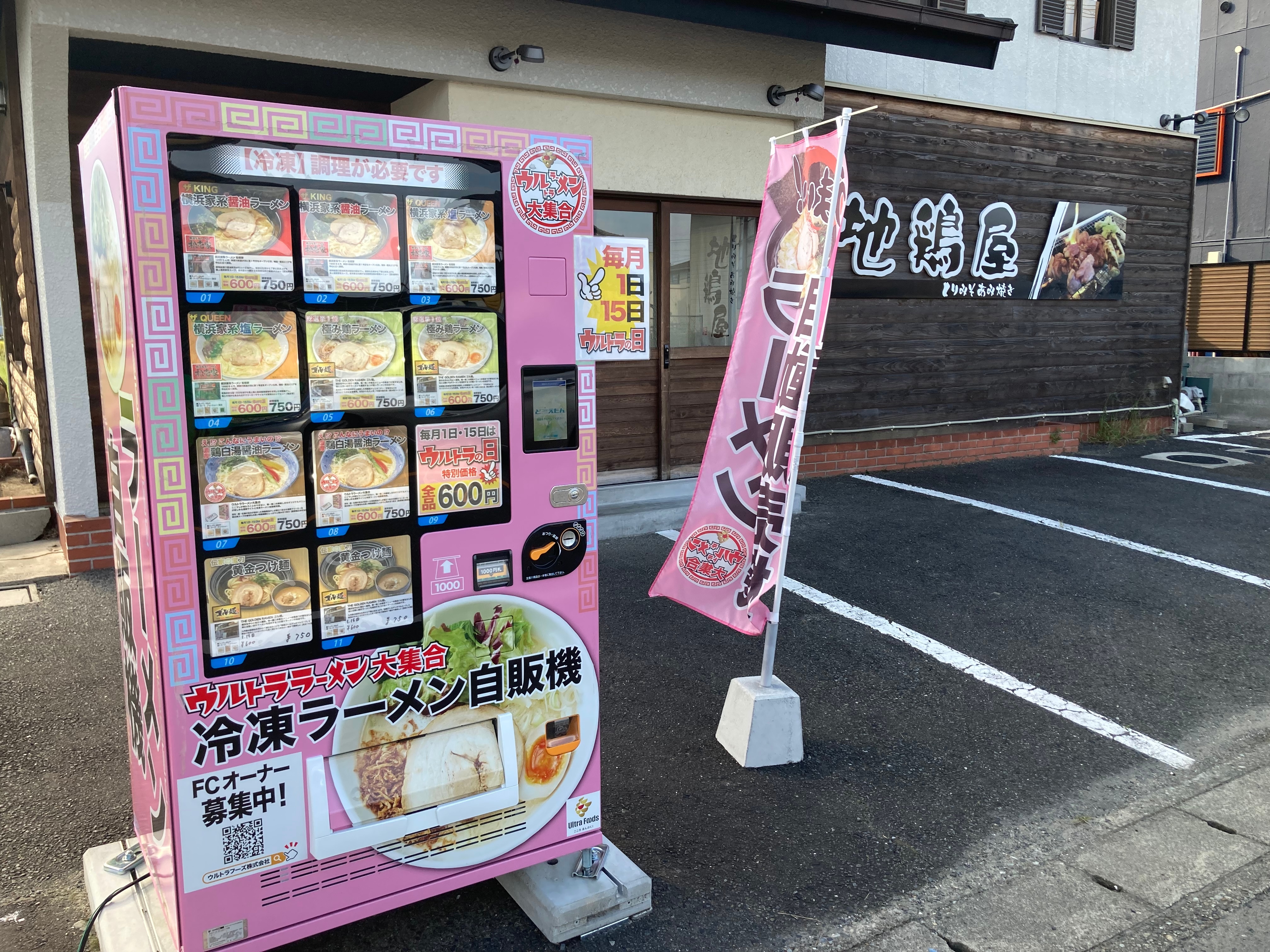 【とりみそ 網焼き 地鶏屋 藤方店】さんを目指して来て下さると、店舗の目の前にラーメン自販機が置かれています。
