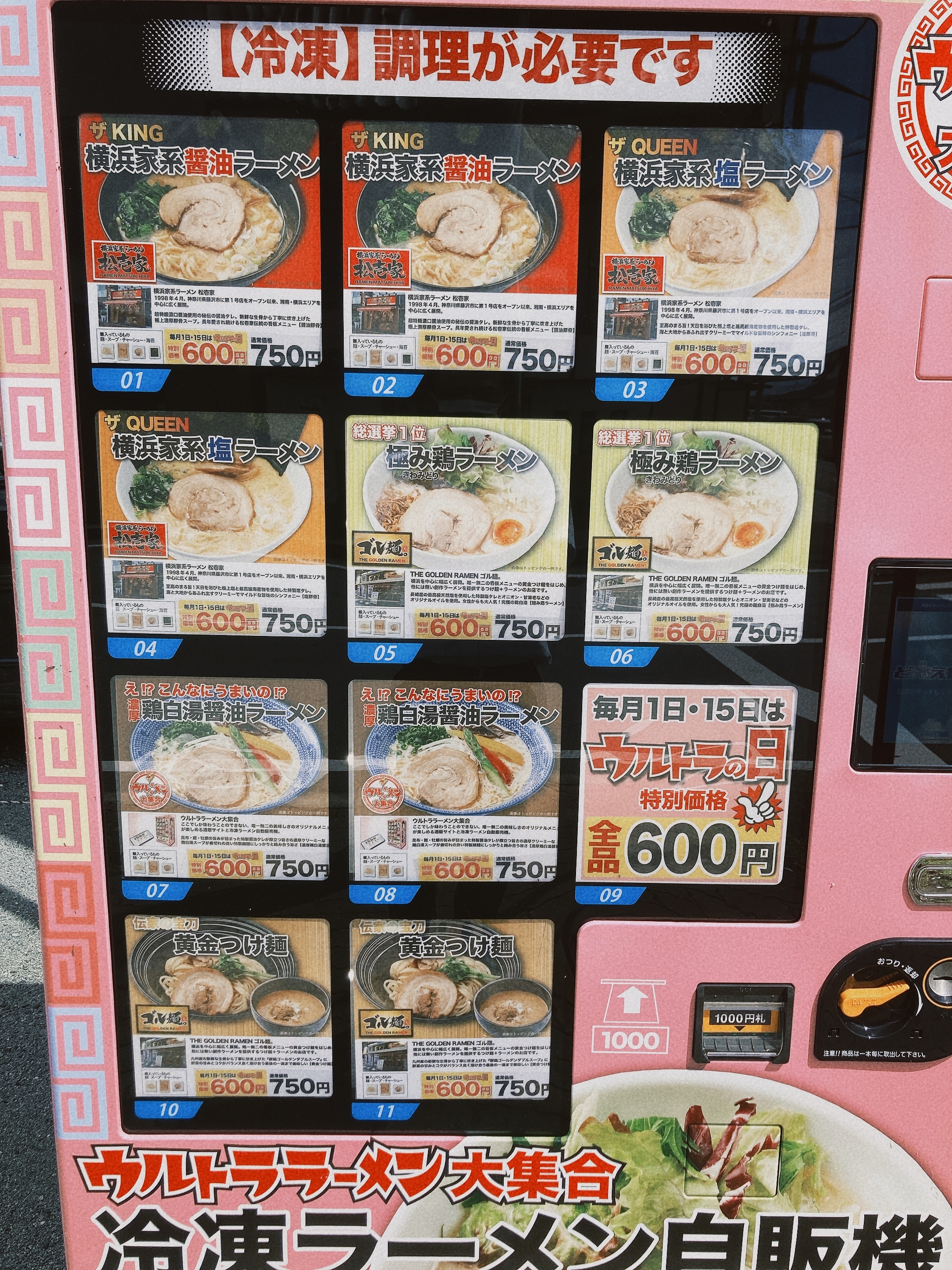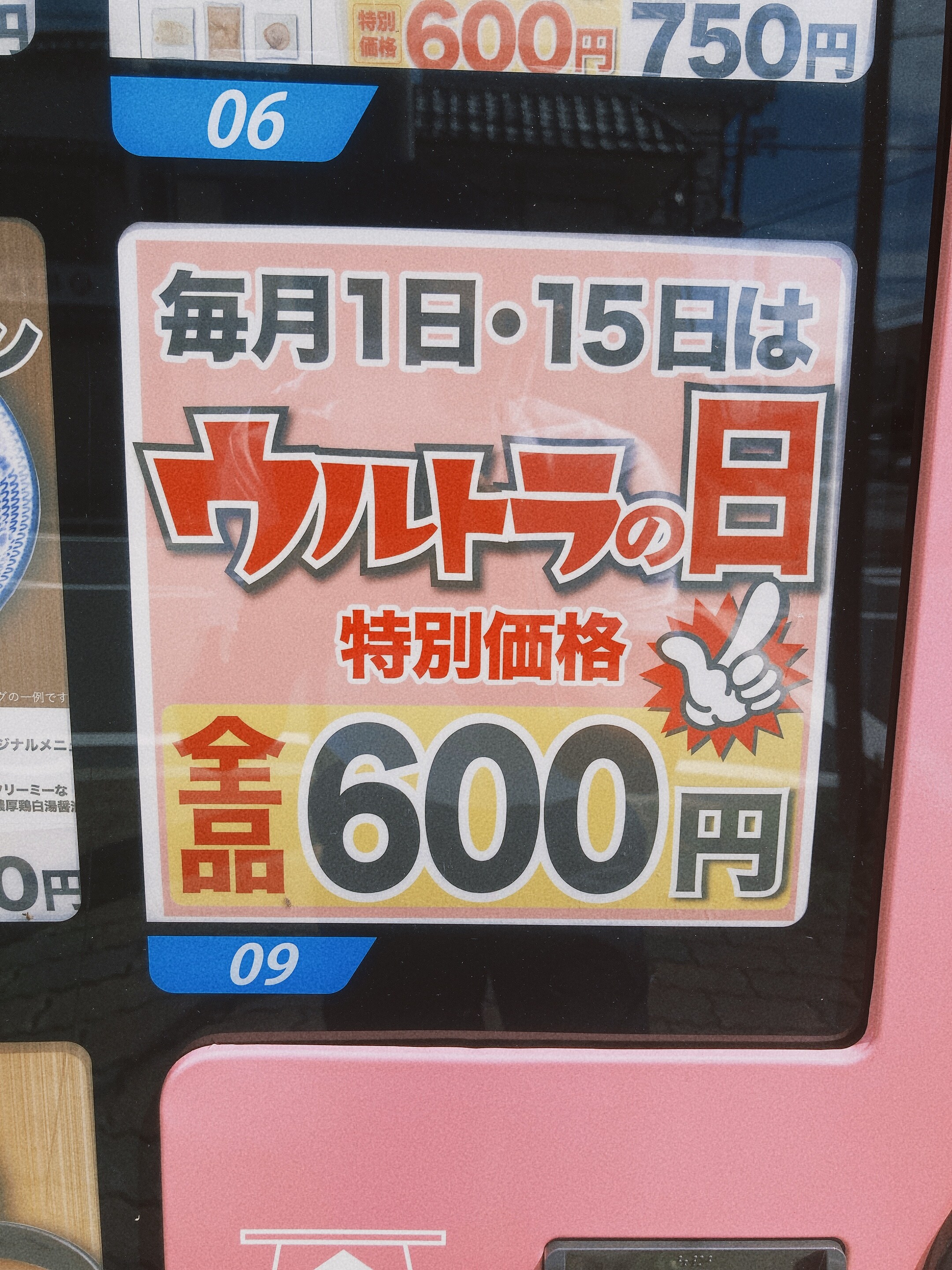 ラーメンは全部で5種類。通常価格は全種類750円ですが、毎月1日と15日は【ウルトラの日】で、なんと!!「全品600円」で購入出来ます。1つ150円もお得なので5人前以上買うなら、いつもよりもう1個お得な計算😊【ウルトラの日】にはまとめ買うのがお勧めです!