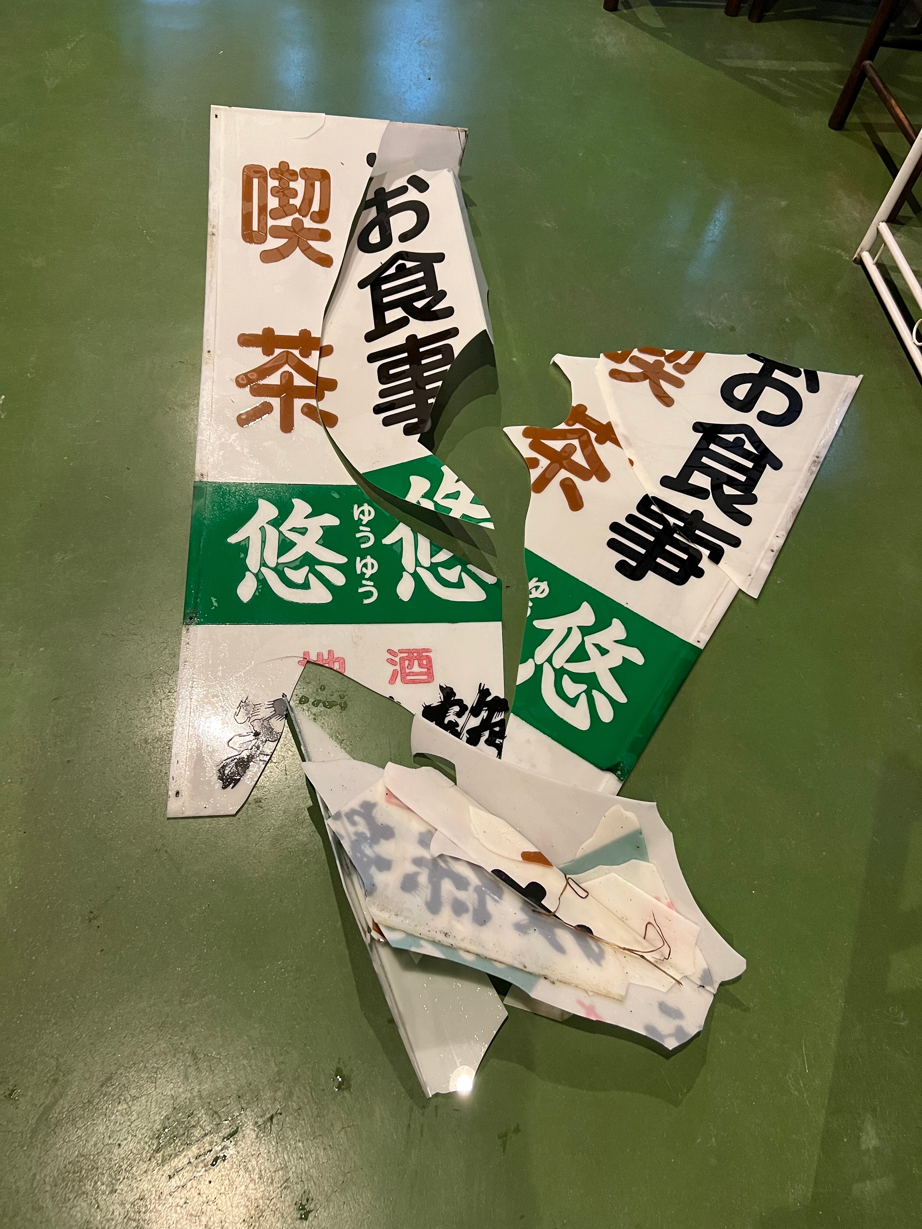 幸いに、早朝に妻が気付き、散乱した破片を回収し、風雨の中、残った残骸を撤去しました。