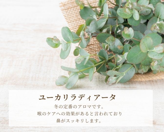 今回は定番人気のユーカリです。スーッとして鼻や喉のケアに効果があることでよく知られています。「ユーカリラディアータ」は、ユーカリの中でもソフトなタイプです。鼻や喉の癒しになればと思います。