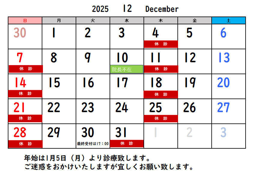 11・12月 診察日カレンダー