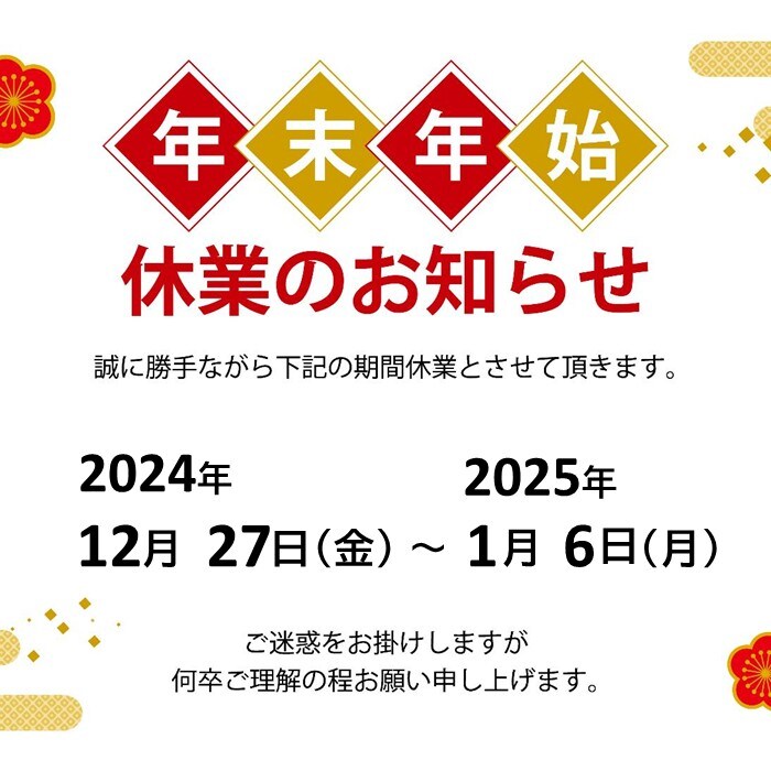 年始休業期間のお問い合わせにつきましては1月7日以降の回答となりますので、ご了承のほどよろしくお願いいたします。