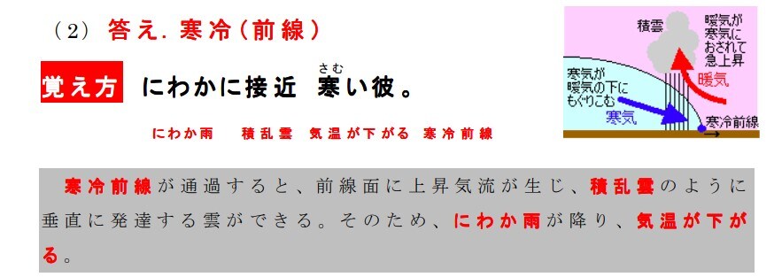 知らんぞウンコ穏やかだ 例えば、暗記術で一番人気なのが 「知らんぞウンコ穏やかだ」 というもの。これ何かわかりますか? 生徒もこの「ウンコ」で授業もどっとわきます。これは 「温暖前線」 の暗記方法です。 知【らん】 ・・・乱層雲 穏やかの【お】 ・・・温暖前線 穏やか ・・・穏やかな雨 とその特徴が覚えられます。もちろん、解説もつけると 温暖前線 は 、暖気が寒気の上にゆっくりとはい上がり、乱層雲 が 広く発達する。温暖前線が接近するにつれ、 穏やかな雨 が降り続く。