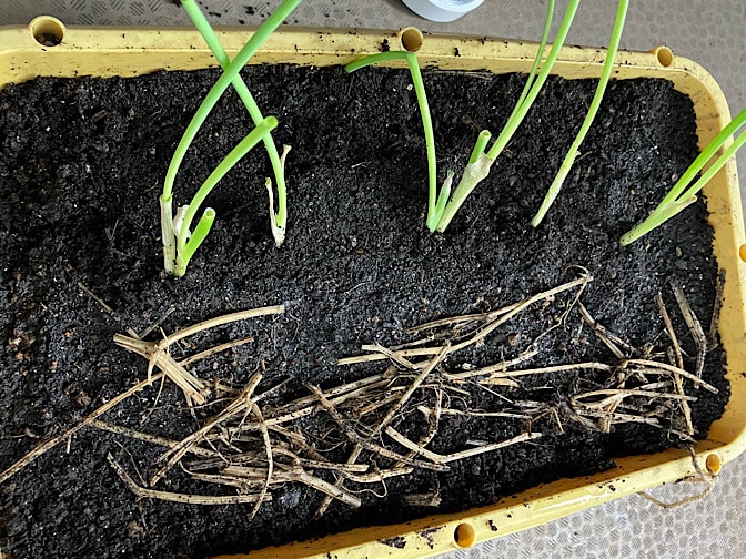 そして、具合を見るために、水に浸けて根出しをしておいた九条ネギを植えました。