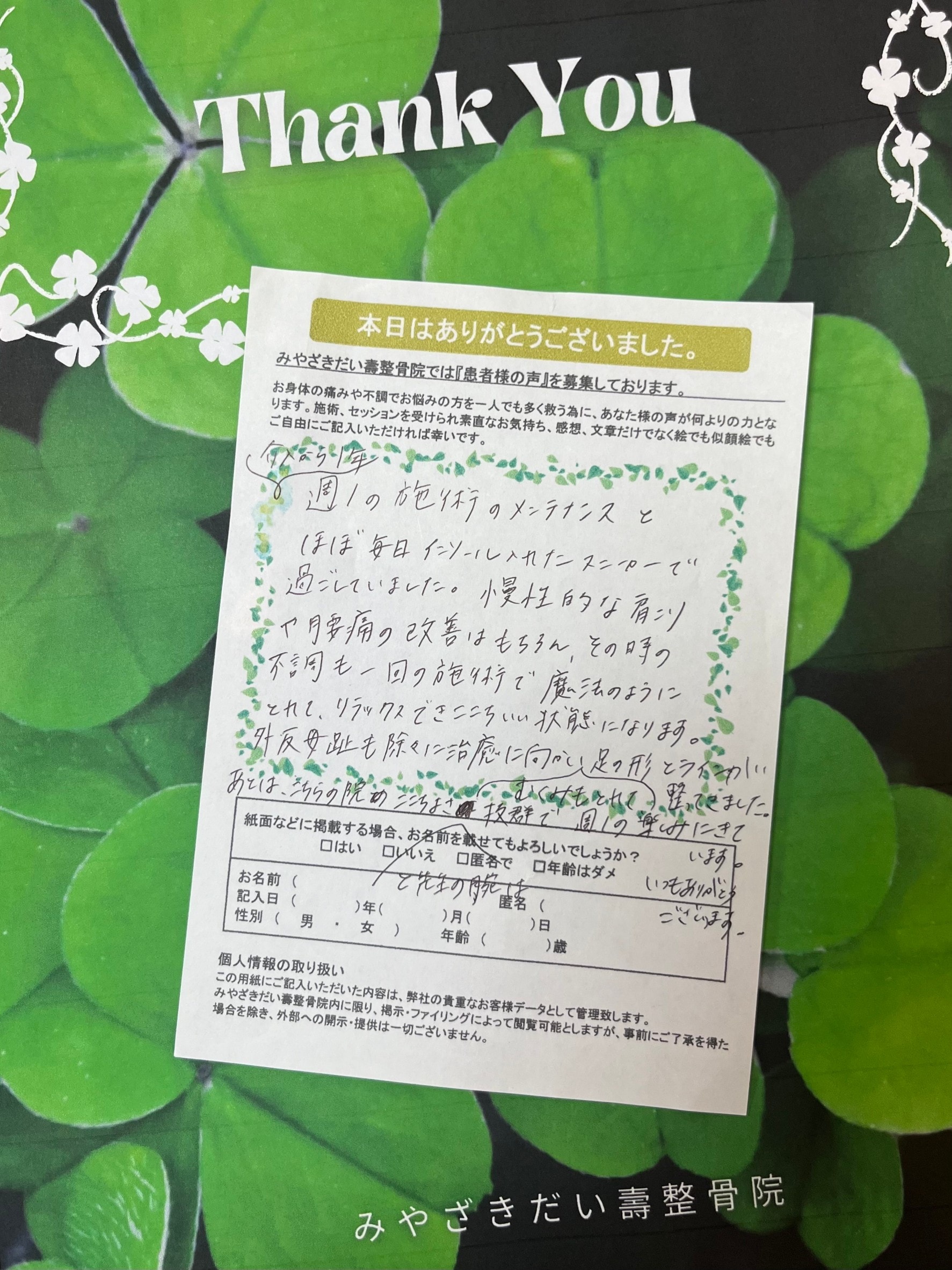 慢性的な肩こりや腰痛の改善はもちろん、その時の不調も一回の施術で魔法のようにとれて、リラックスできここちいい状態になります。
